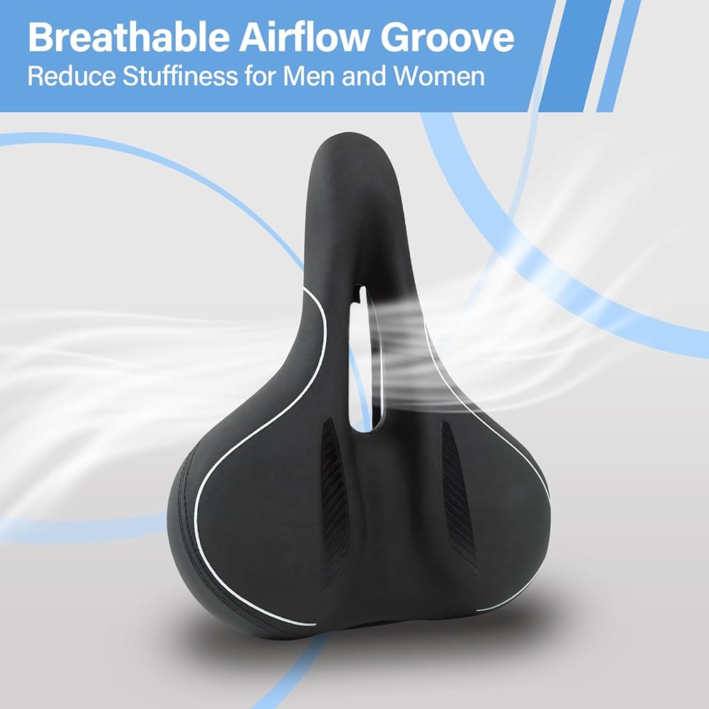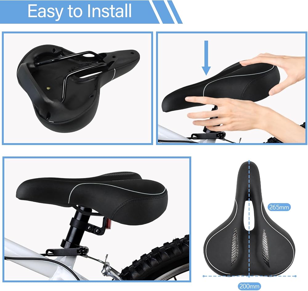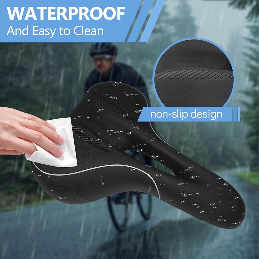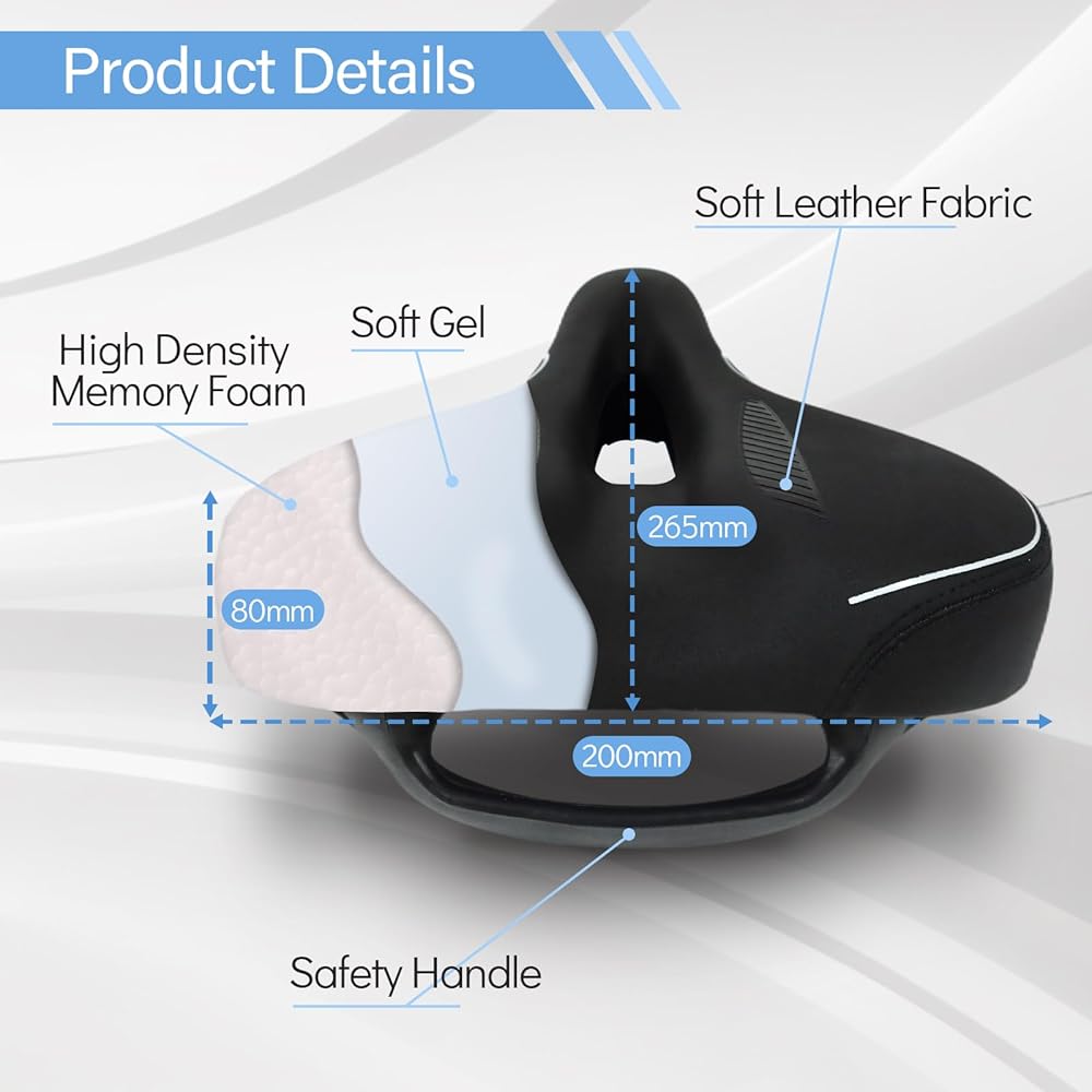 【ناعم ومقاوم للماء ومضاد للانزلاق】سطح سرج الدراجة مصنوع من جلد البولي يوريثان وبالتالي فهو أكثر مقاومة للتآكل والخدش والانزلاق والراحة. الجزء الداخلي من المقعد مملوء برغوة هلامية ناعمة وعالية الكثافة، مما يمنح سرج الدراجة درجة عالية من المرونة لحماية أفضل للورك وأفضل تجربة ركوب لك ولعائلتك.
