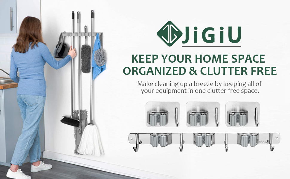 【خطوة واحدة من الفوضى إلى ديكور المنزل】يحتوي حامل مكنسة Jigiu على قطعة واحدة و3 رفوف و4 خطافات و3 قطع رف واحد وخطاف واحد، إجمالي 13 وضعًا لك لتنظيم مستلزمات التنظيف الخاصة بك. إنها توفر مساحة للمنزل، وتحافظ على نظافة المنزل، وتقول وداعًا للفوضى إلى الأبد. (ملاحظة: نوصي بحفر فتحة لتثبيت حامل مكنسة مقاس 15 بوصة)