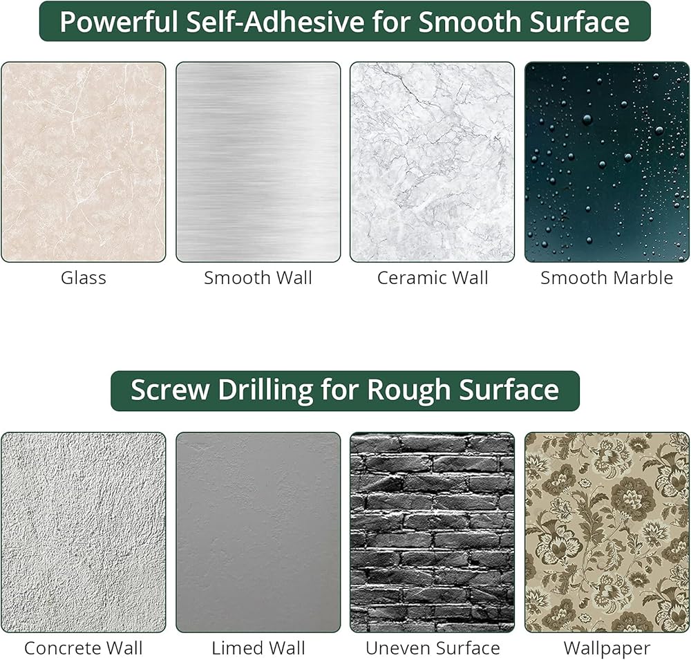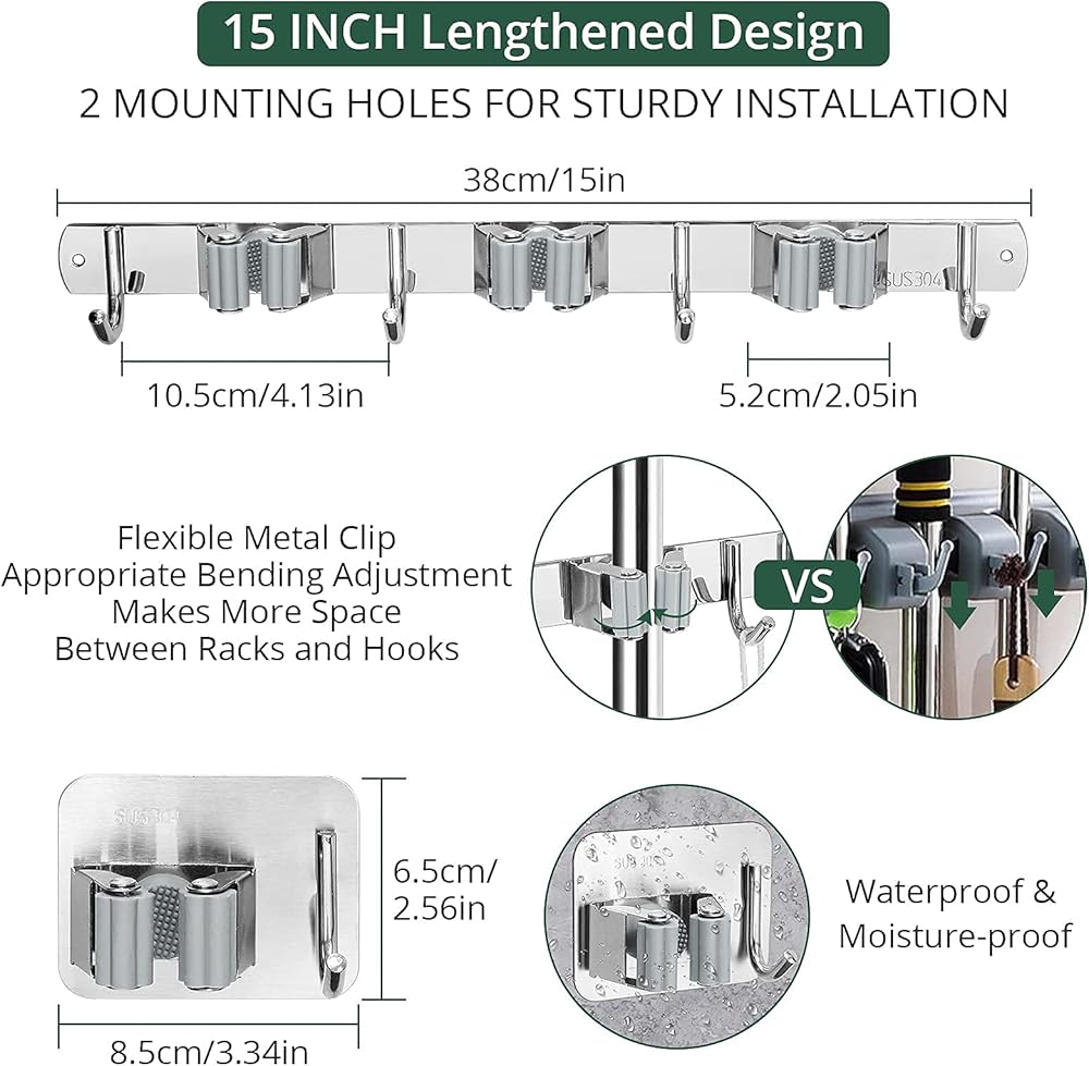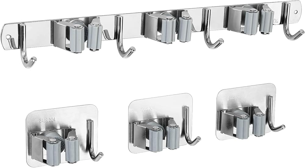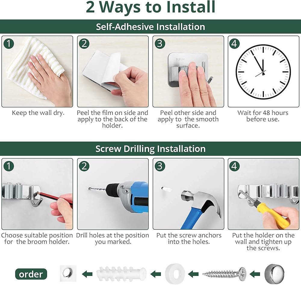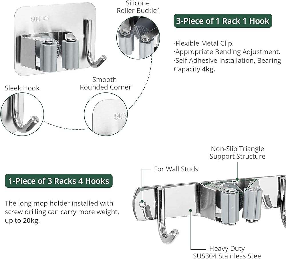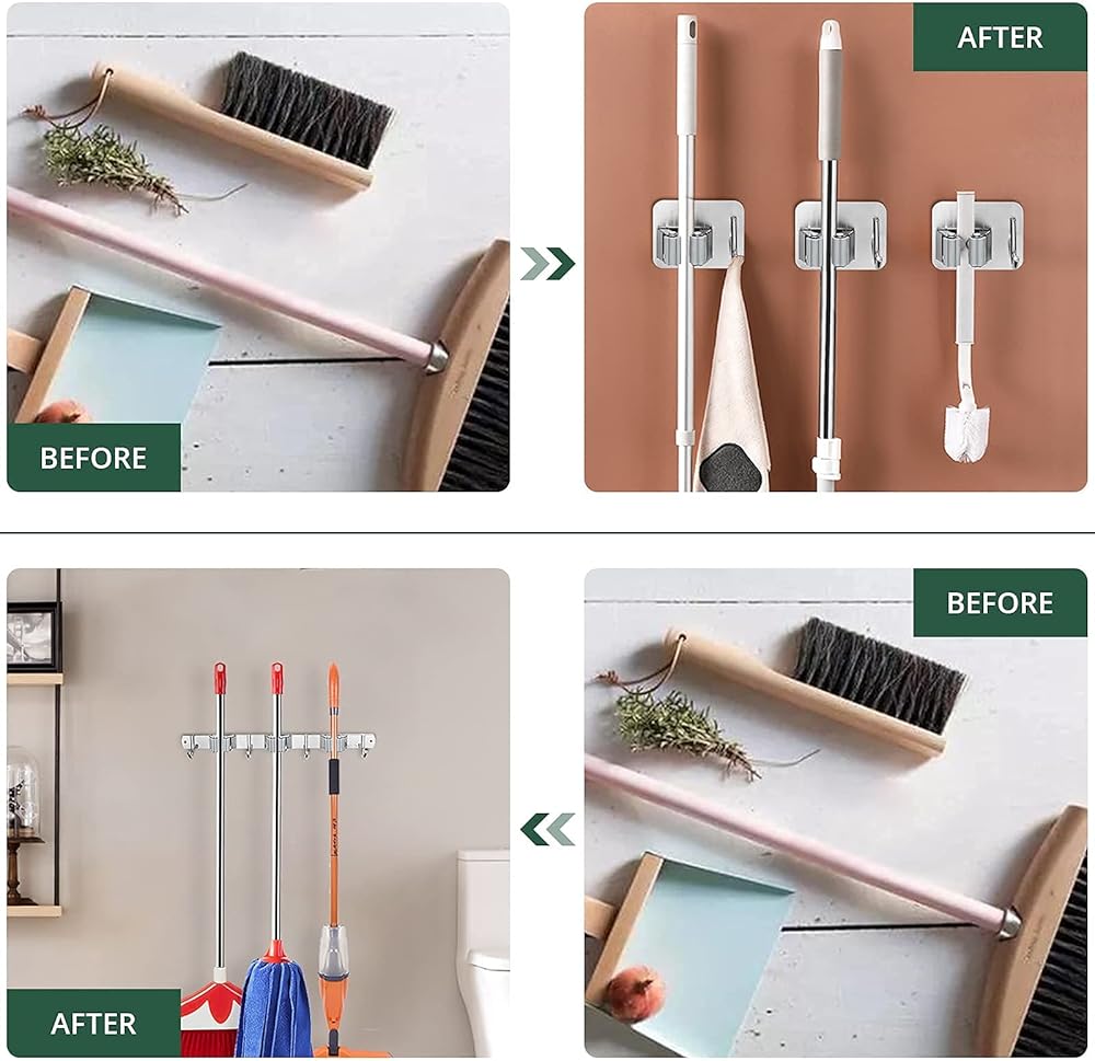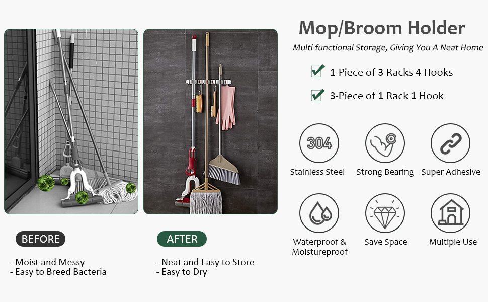 【تركيب على الحائط】 حامل ممسحة المكنسة مع رف واحد وخطاف واحد صغير ومرن. يمكنك تثبيته بشريط لاصق قوي في أي مكان تريد حمل أدواتك فيه، وهو مثالي للمساحات الصغيرة. يوفر حامل ممسحة المكنسة المزود بـ 3 رفوف و4 خطافات مكانًا أكبر للتخزين، ونوصي المستخدمين بتثبيته باستخدام شريط لاصق قوي ومسامير لاستخدام طويل الأمد.