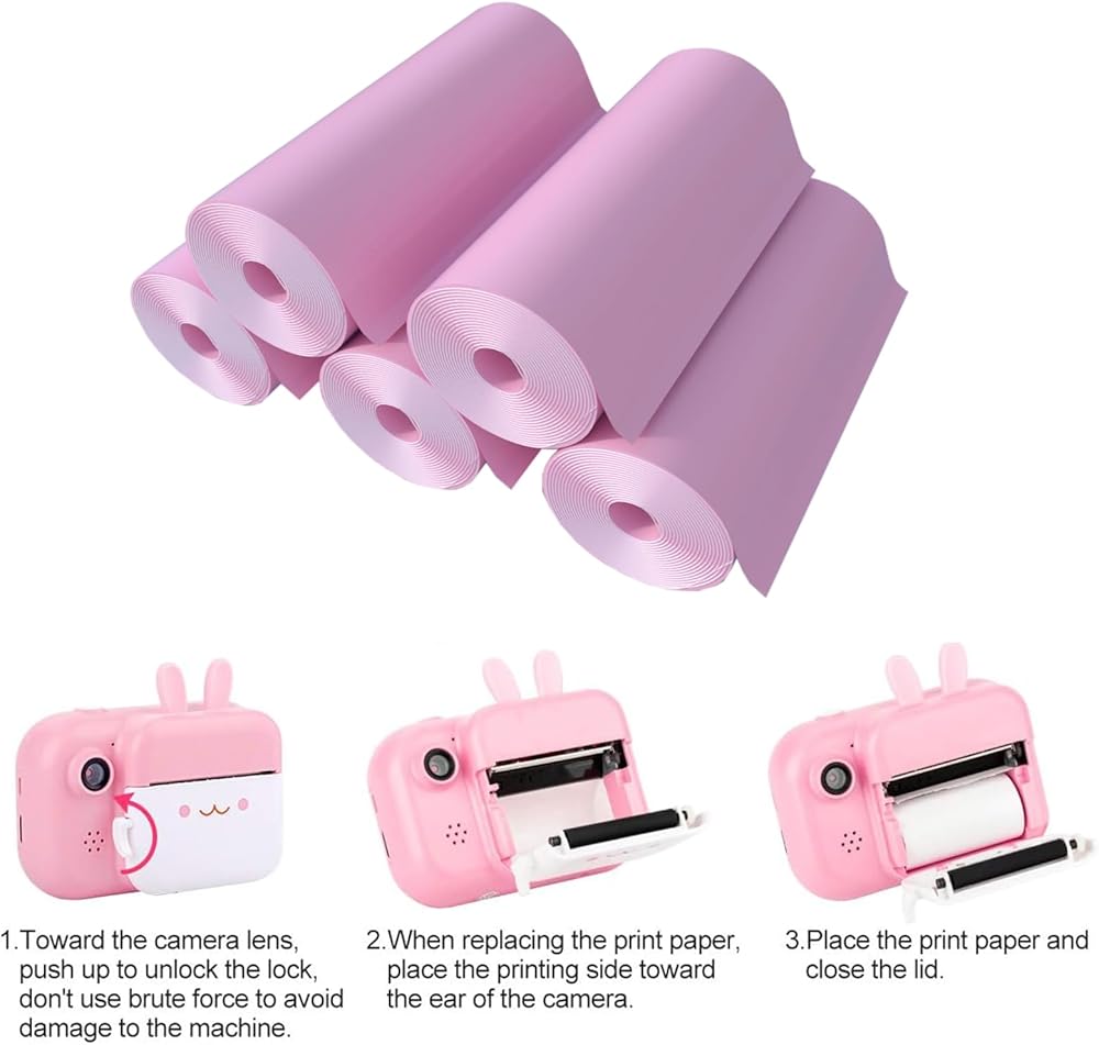 سهل الاستخدام: تم تصميم الورق الحراري الخاص بالكاميرات ليكون متوافقًا مع مجموعة متنوعة من أنماط الكاميرات الفورية للأطفال. يعد تثبيت الورق أمرًا سهلاً للغاية، حيث يحتاج الأطفال فقط إلى اتباع الاتجاه الصحيح عند إدخاله والتأكد من بقائه داخل غطاء الكاميرا.