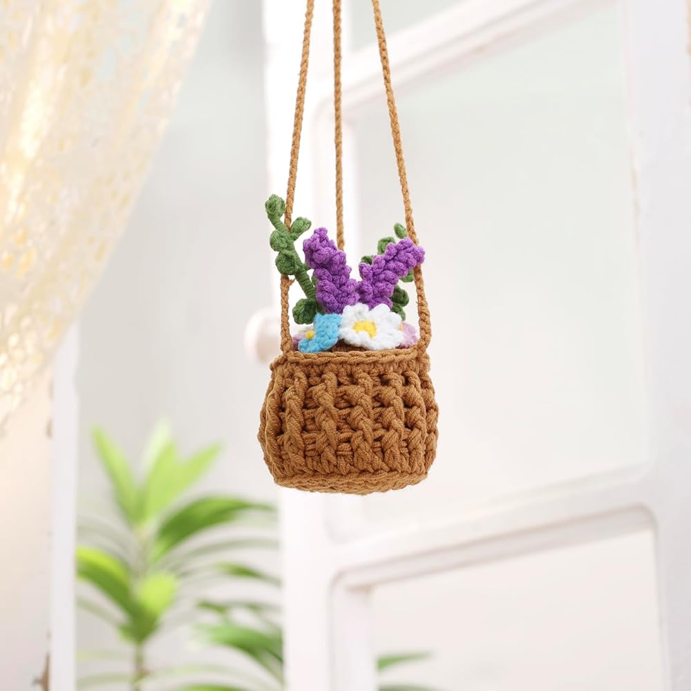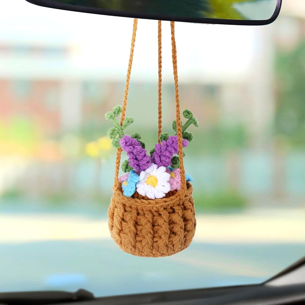 Vansolinne لطيف اكسسوارات السيارات الكروشيه سيارة سلة معلقة لمرآة الرؤية الخلفية ديكور زهرة النبات اكسسوارات السيارات الداخلية الجمالية عشاق النباتات الهدايا للنساء والرجال السائقين