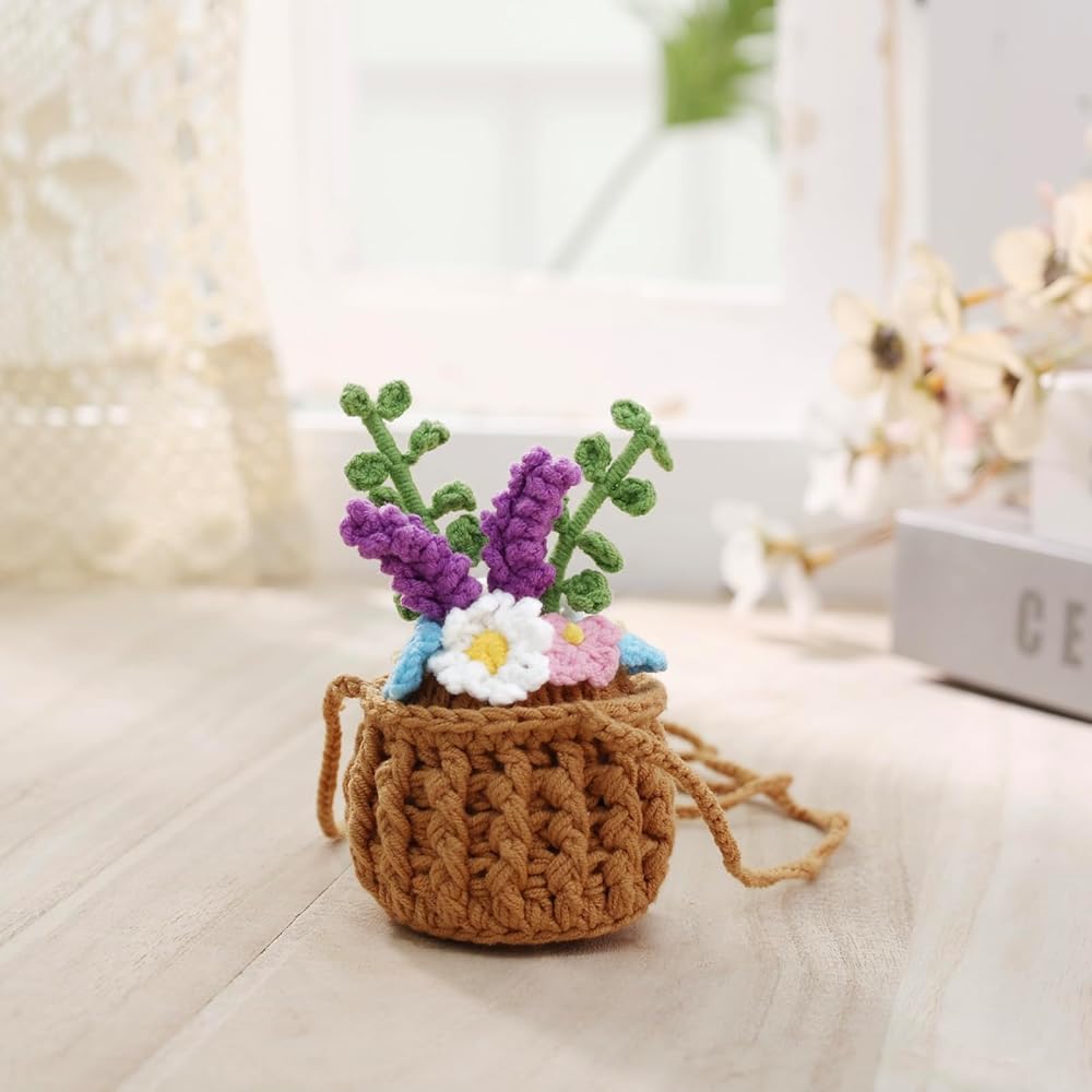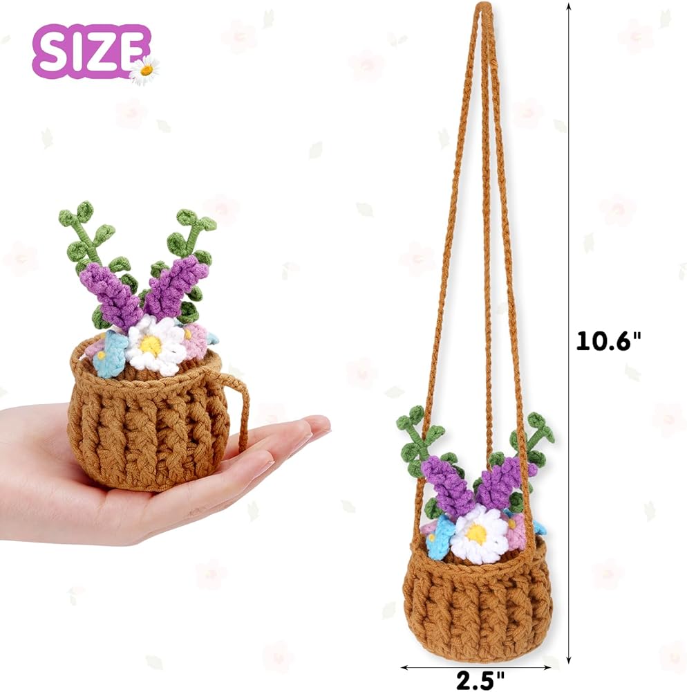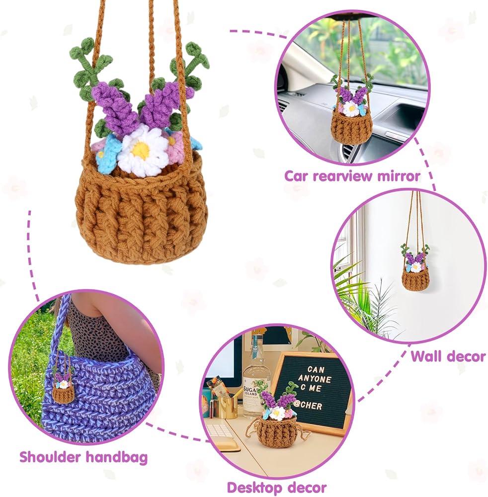 تطبيق واسع - يمكن استخدام سلة الزهور الكروشيه اللطيفة هذه لتزيين مرآة السيارة، أو التعليق على الحائط، أو تزيين سطح المكتب، أو تعليقة حقيبة اليد على الكتف. يمكن استخدامها أيضًا كهدية رائعة للأصدقاء أو الأمهات أو العشاق أو السائقين الجدد أو لنفسك.
