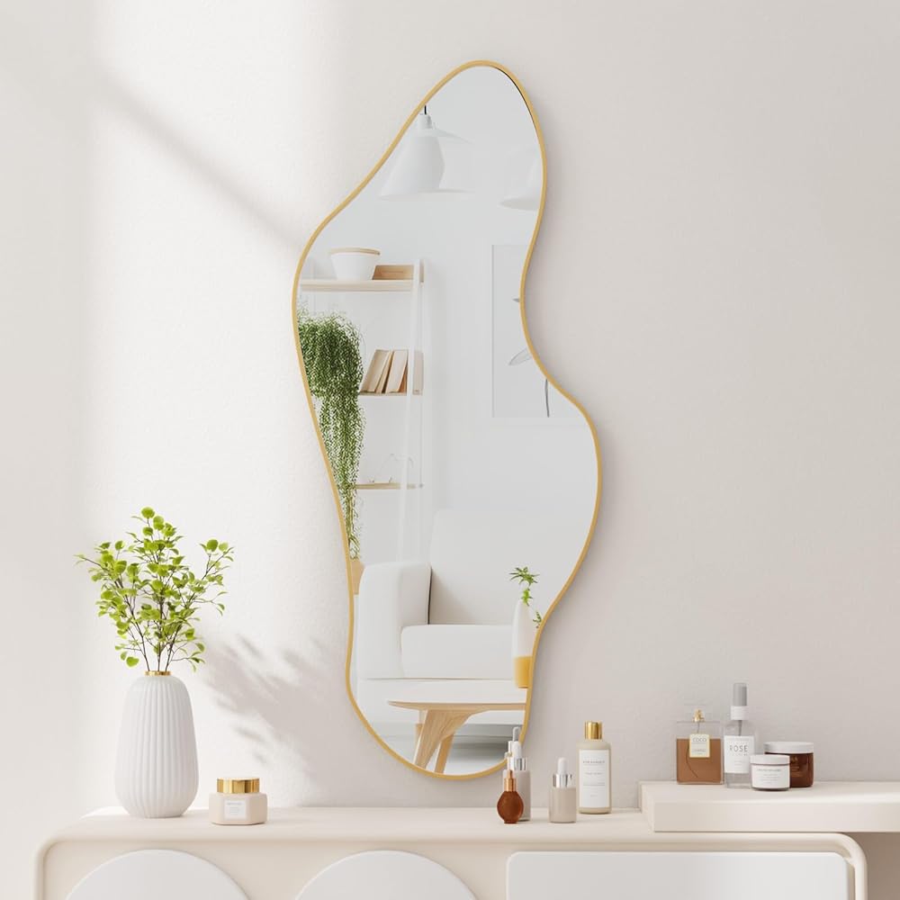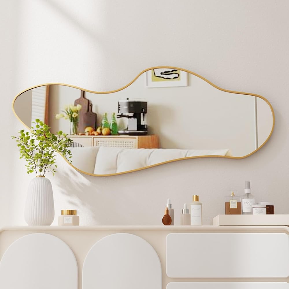مرآة حائط غير منتظمة غير متماثلة للجدار مقاس 19.6 بوصة × 47 بوصة مرآة حائط بإطار ذهبي لغرفة المعيشة والحمام وغرفة النوم والمدخل، على شكل سحابة