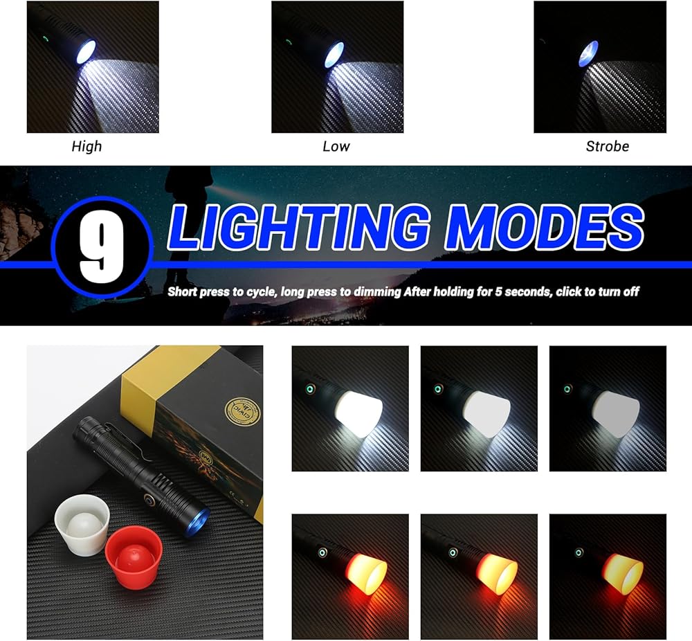 🔦3 أوضاع إضاءة وتعتيم بدون خطوات - تحتوي هذه المصابيح الكاشفة القوية على 3 إعدادات مختلفة: عالية ومنخفضة وفلاش. سهولة تشغيل الأزرار التكتيكية. تعتيم بدون خطوات بضغطة طويلة. قم بإيقاف تشغيل المصباح التكتيكي مباشرة بعد 5 ثوانٍ في أي من الأوضاع.