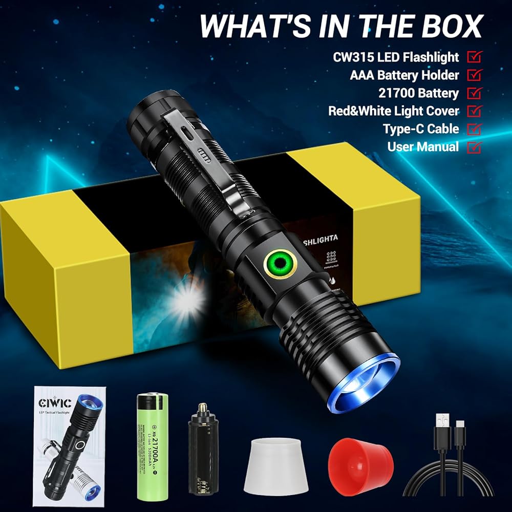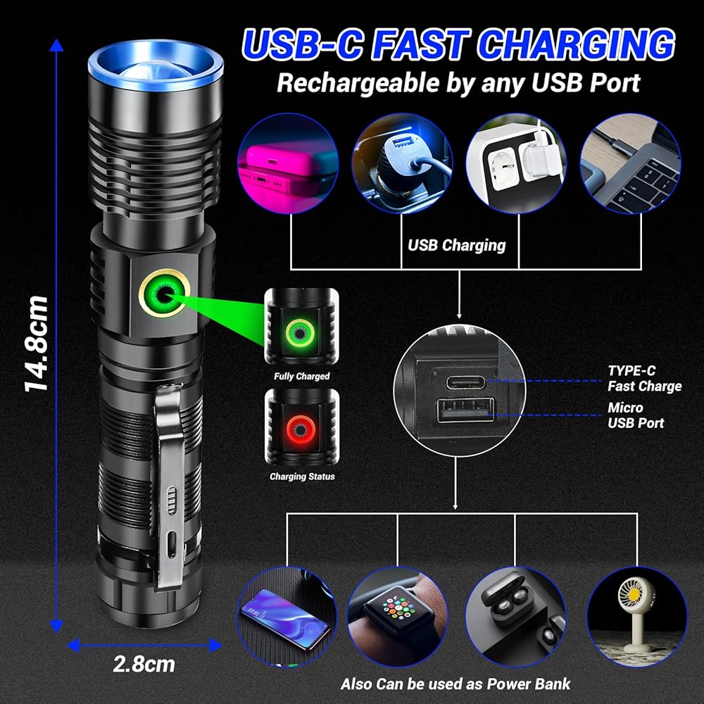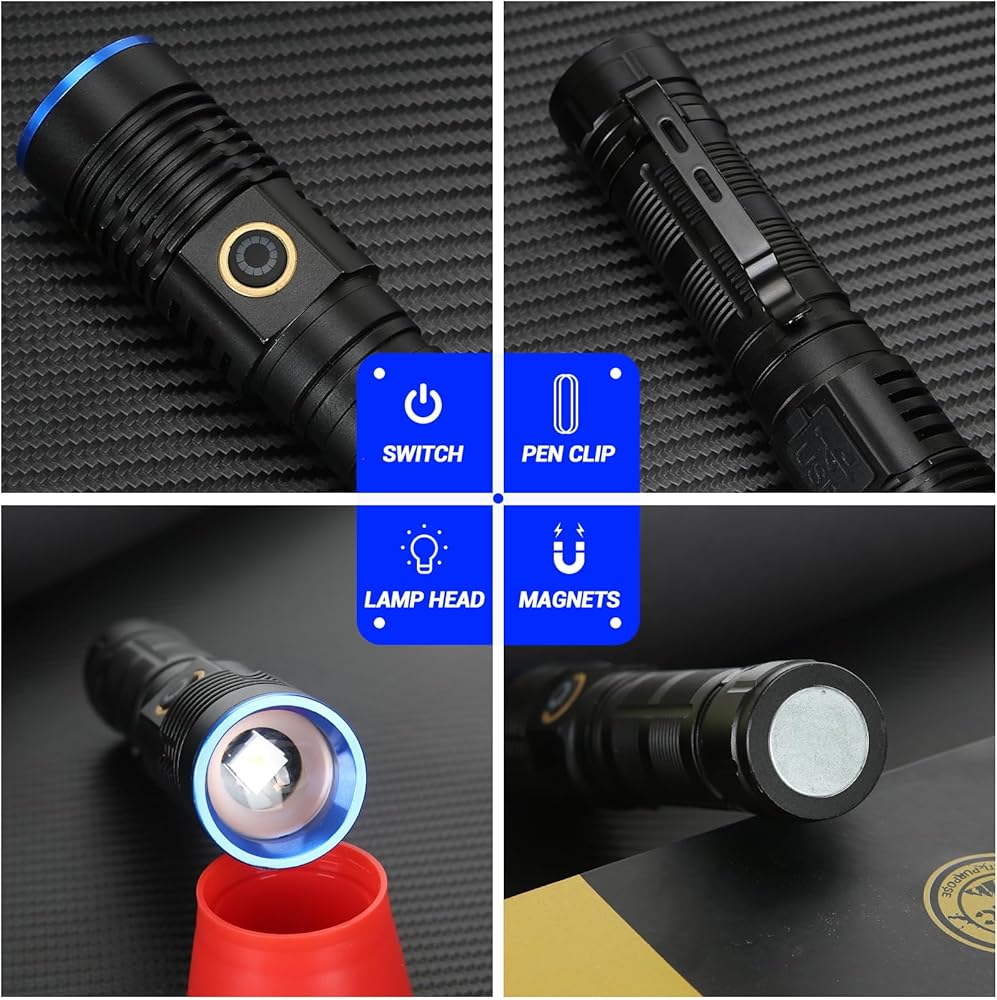 🔦وقت تشغيل طويل وبطارية 6800 مللي أمبير في الساعة - يأتي هذا المصباح اليدوي عالي الطاقة مع بطارية قابلة لإعادة الشحن بسعة 6800 مللي أمبير في الساعة، مما يسمح له بتوفير 6-15 ساعة من السطوع القوي على الرغم من أنه صغير الحجم للغاية. يمكنك الوثوق بأنه سيستمر عندما تكون في أمس الحاجة إليه.