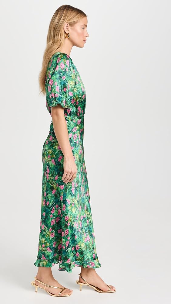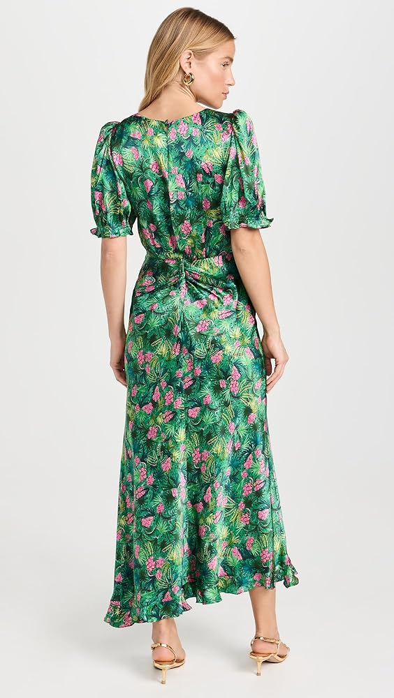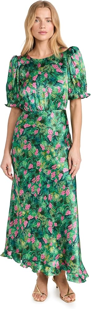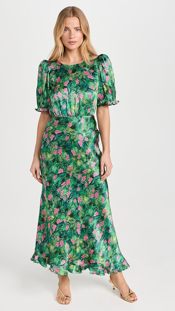 تنورة مائلة لتمدد دقيق وثنية سائلة، حاشية مكشكشة غير متماثلة، طباعة زهور