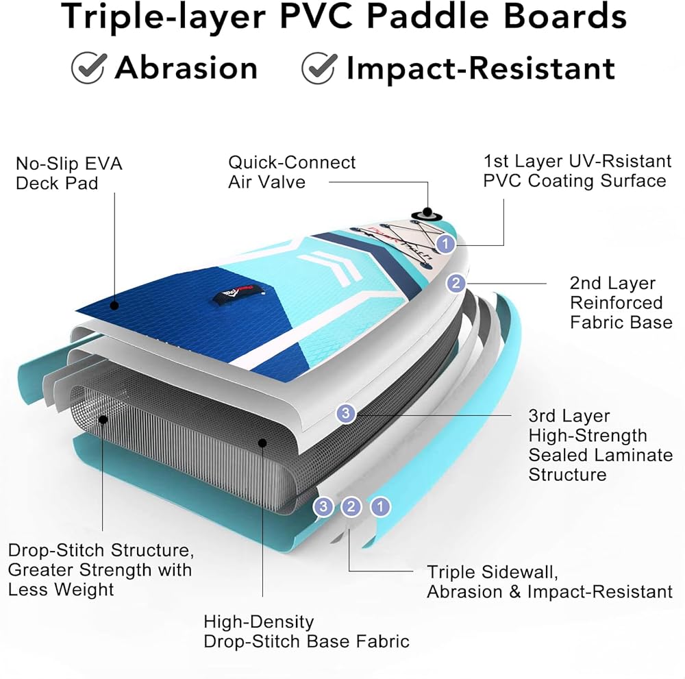 [Premium Material, Lightweight Design] The SUP board shell is made of thick triple-layer PVC material, providing excellent durability and stability to better handle potential risks of rocks and impacts during water navigation. The interior utilizes Drop Stitch technology, forming a dense and even fiber network structure. Reducing weight while enhancing compression strength and maintaining a balanced center of gravity as well.