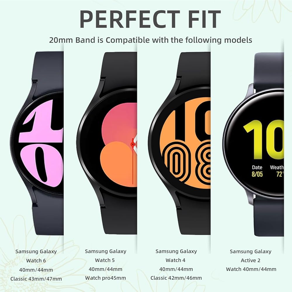 ☀ 【متوافقة بشكل كبير】أساور زهور لطيفة من GEAK متوافقة مع أحدث ساعة Samsung Galaxy Watch 6 Classic 47mm 43mm، Galaxy Watch 6 44mm 40mm/Galaxy watch 5 40mm 44mm/ Galaxy Watch 5 Pro 45mm، Galaxy Watch 4 40mm 44mm/ Galaxy Watch 4 Classic 42mm 46mm ، ساعة Galaxy Watch Active 2 44 مم 40 مم/ ساعة Galaxy Watch Active 40 مم، ساعة Galaxy Watch 3 41 مم/ ساعة Galaxy 42 مم، Gear S3/ S2/ Sport/ Classic، تناسب أيضًا Garmin Vivoactive 3/ Vivomove/ HR، Forerunner 645/ 245، ساعة ذكية أخرى مع عروات ساعة بعرض 20 ملم