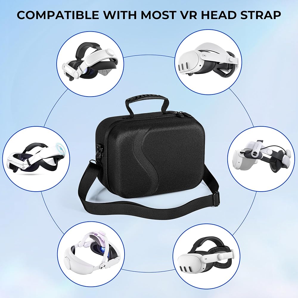 Wide Compatibility: This large carrying case is specially designed for the Meta Quest 3 VR headset and is compatible with various third-party headstraps, including Kiwi Design and BOBOVR battery headstraps.It can also accommodate elite headstraps, touch controllers, chargers, adapter, cables, and other accessories (NOT included).