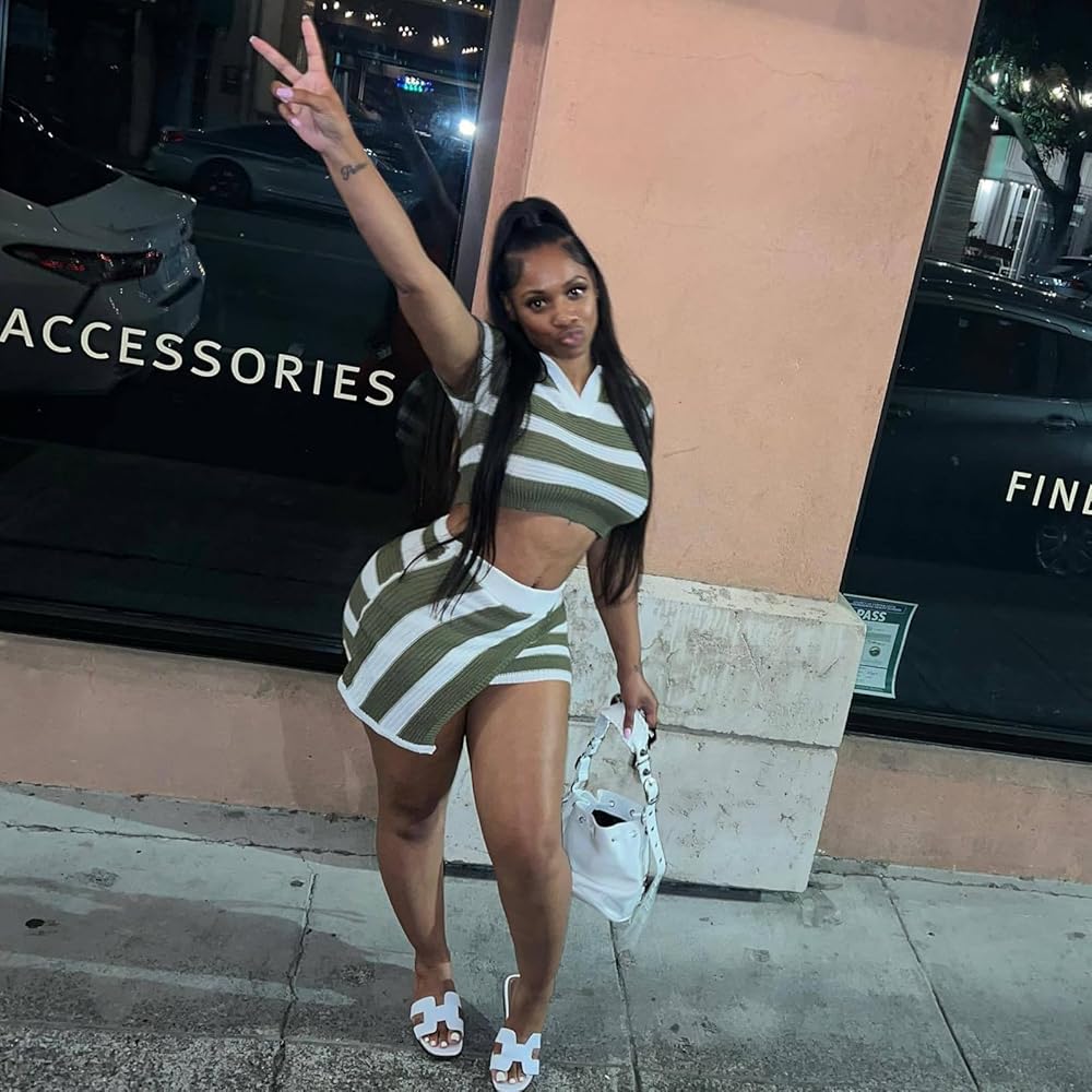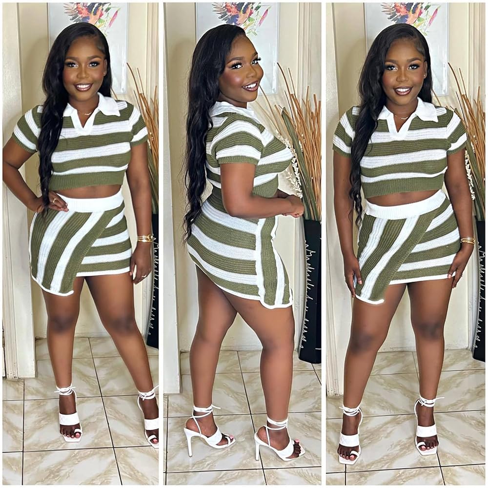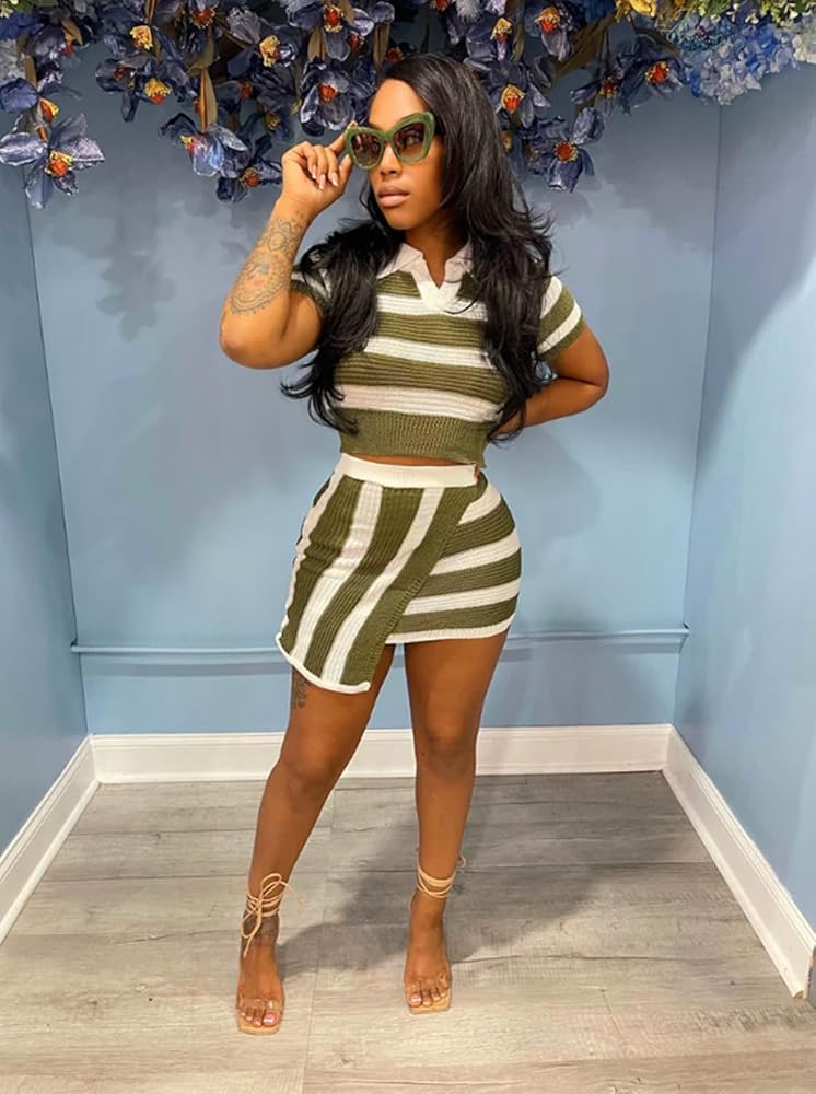 المزايا: ملابس نسائية مكونة من قطعتين، مجموعات تنورة قصيرة غير متماثلة، مجموعات خروج، أكمام قصيرة، رقبة على شكل حرف V، خطوط مطبوعة، حاشية تنورة غير منتظمة، نسيج محبوك ناعم، جسم مثير، خصر مرن، سحب، طول صغير