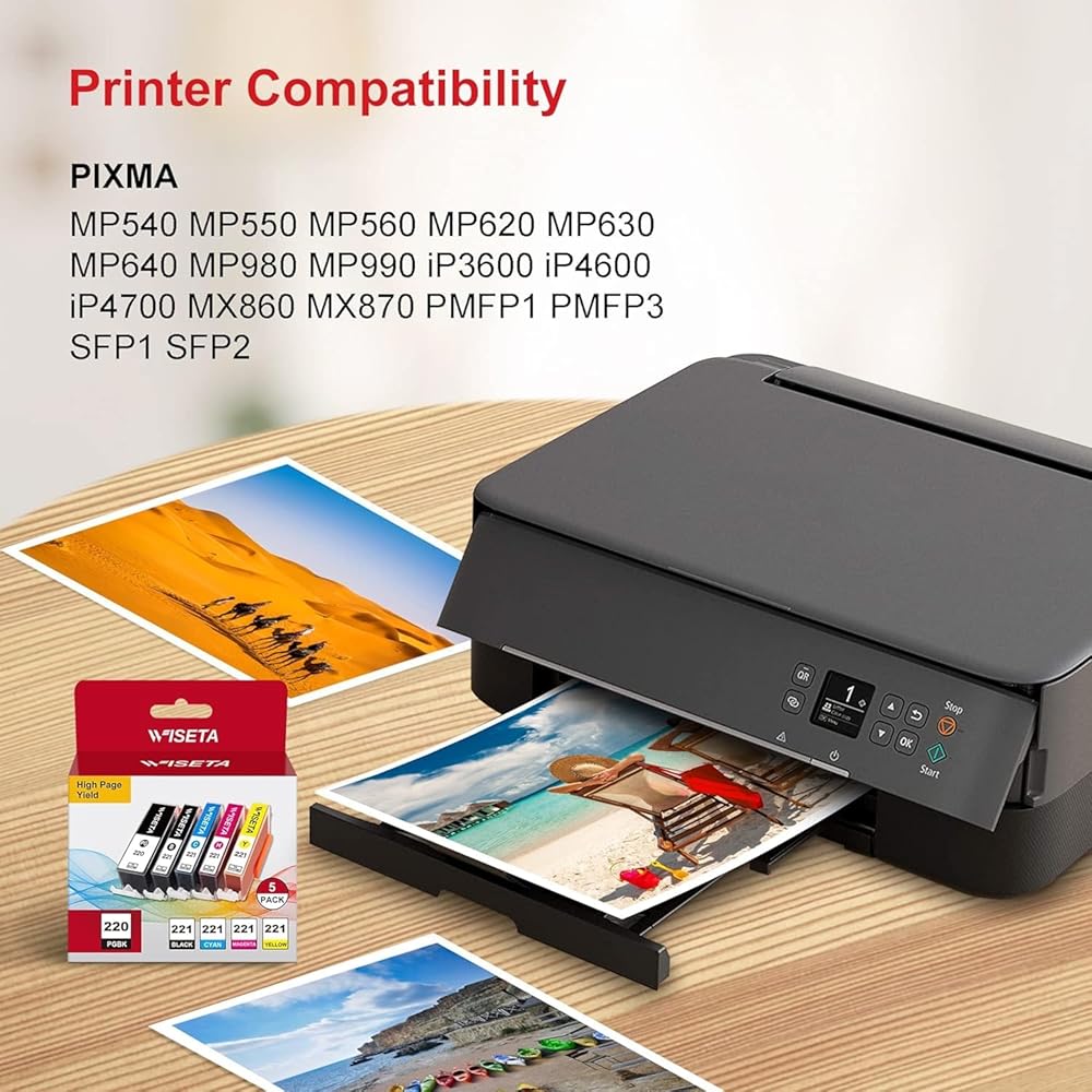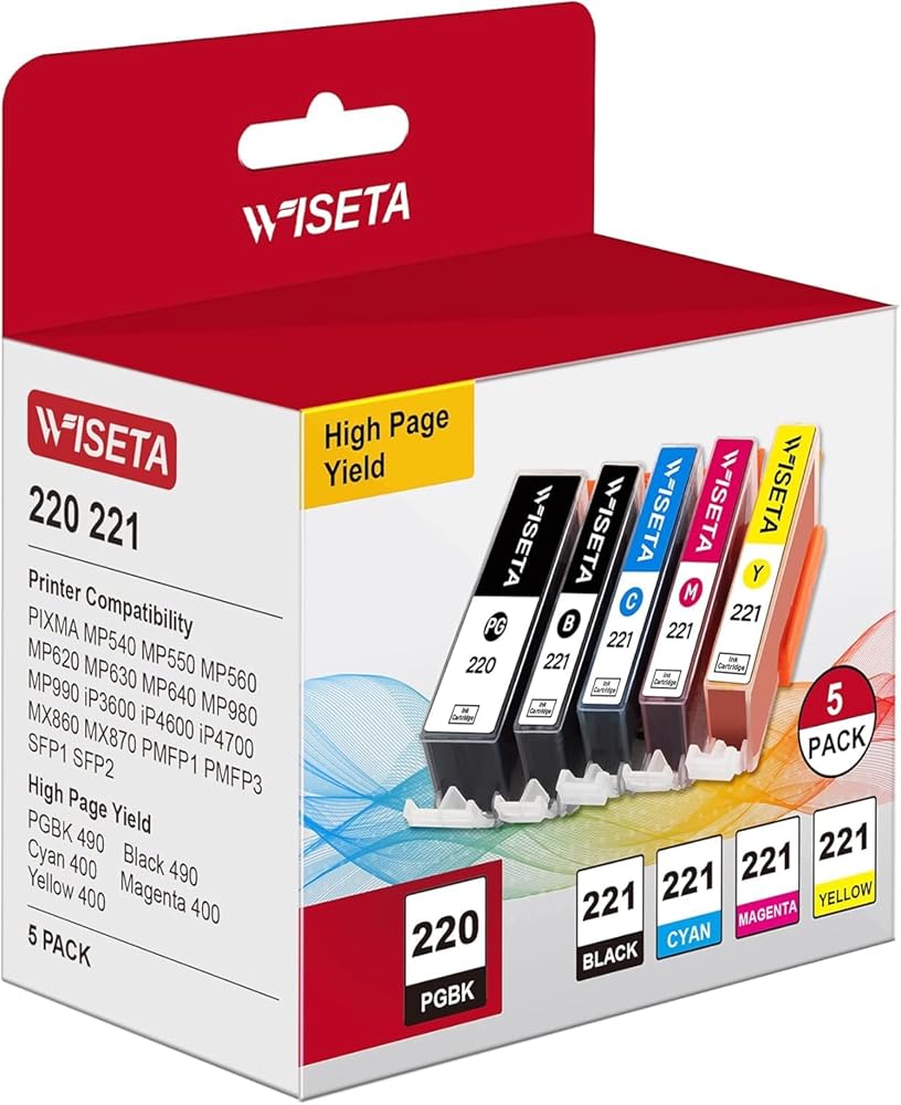 استبدال خرطوشة الحبر المتوافقة Wiseta PGI-220 CLI-221 لخراطيش الحبر Canon 221 220 PGI220 CLI221 للاستخدام مع MP560 MP620 MP640 MX860 MX870 MP980 MP990 iP3600 iP4600 iP4700 (2B1C1M1Y، 5 عبوات)