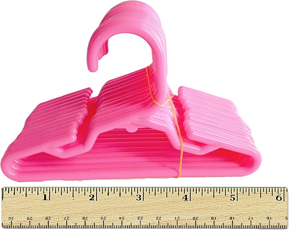 12 Pink , 5.5 Inch Hangers. Compatible with 14 inch doll clothes. Also Compatible with 18 inch doll clothes. Will fit small armoires as these are only 5.5 inches wide. Ages 3+