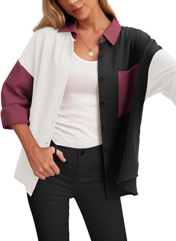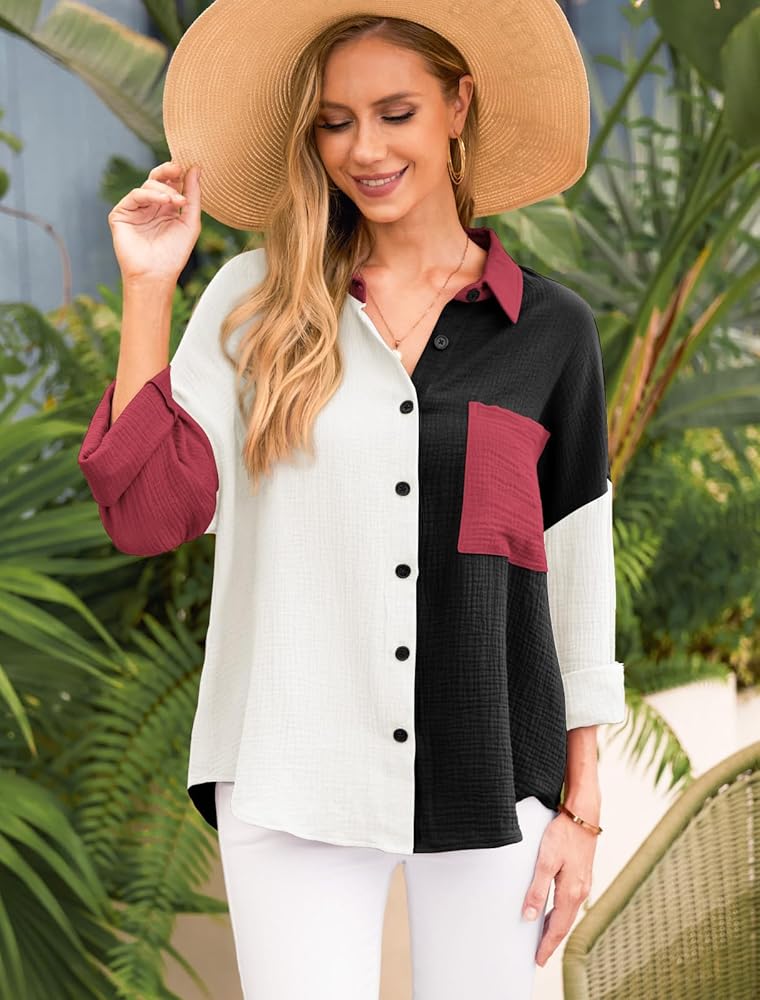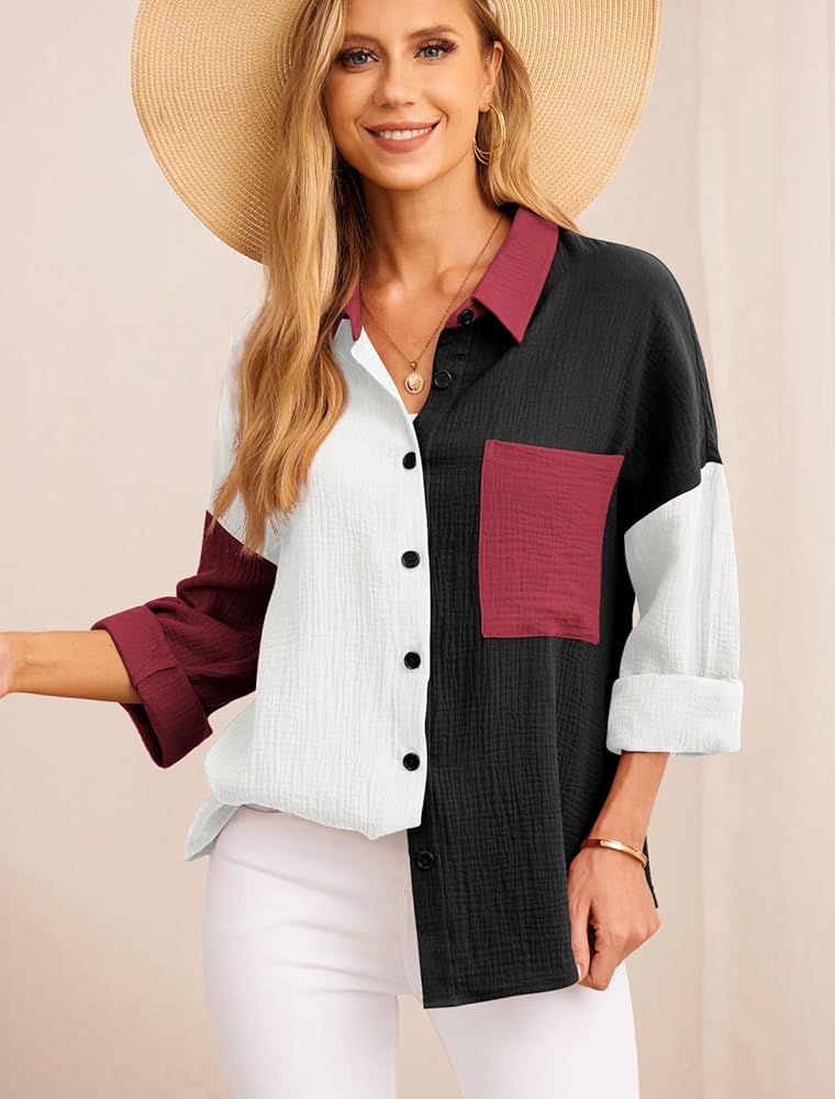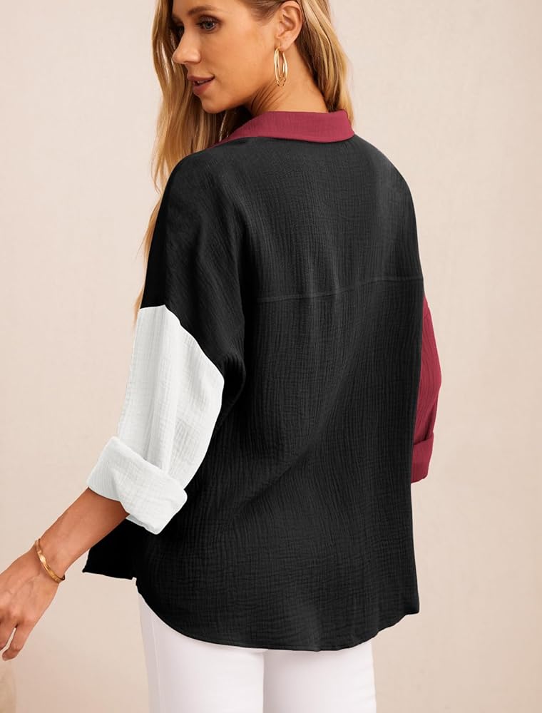 الميزة: كتلة الألوان، لون خالص، إغلاق بأزرار أمامية، جيب على الصدر، أكمام طويلة مع أساور بأزرار، يمكن ارتداؤها كأكمام 3/4 أو كم كامل، ياقة مطوية للأسفل، نمط الصديق، قمصان فضفاضة