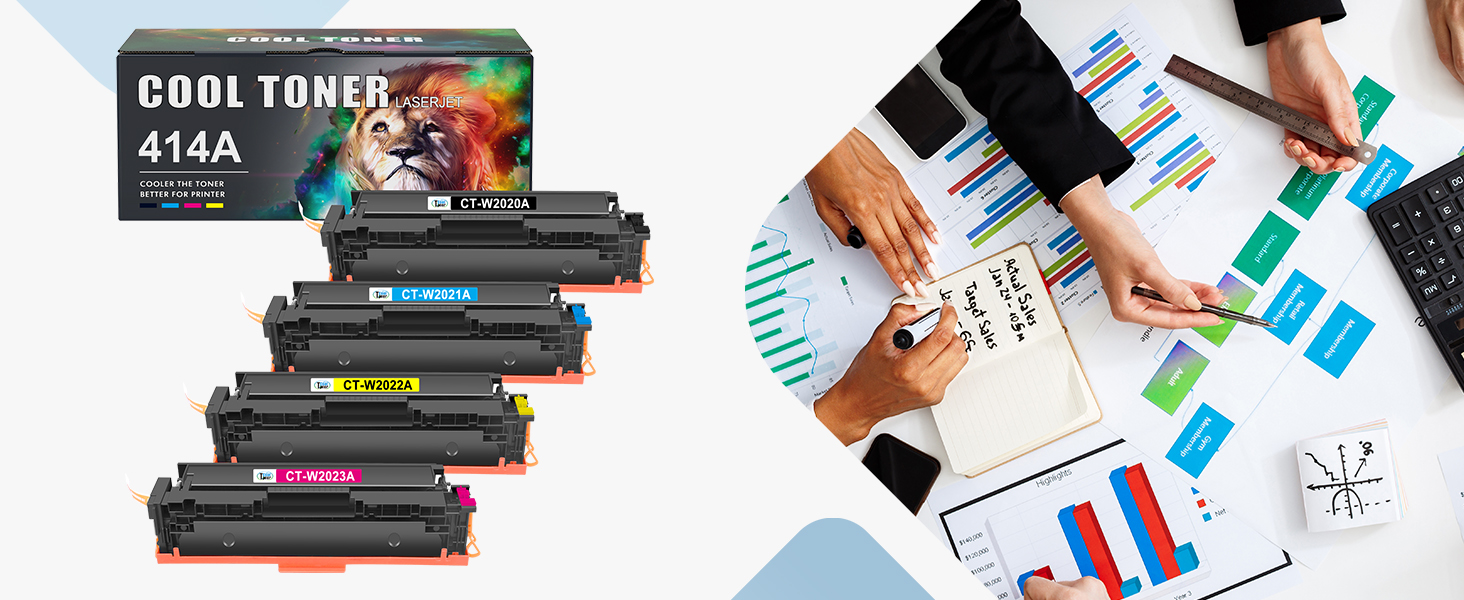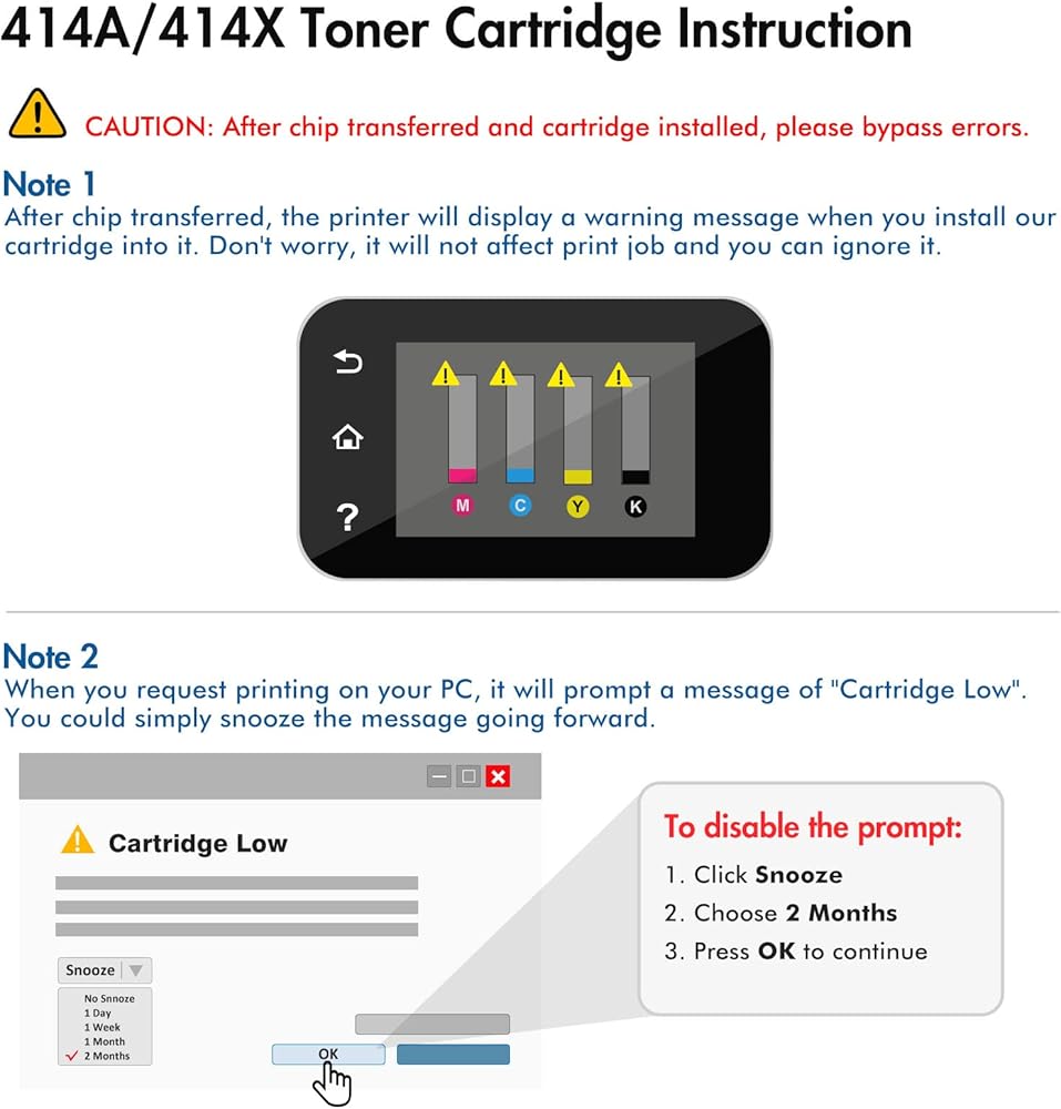 • ملاحظة: لا تحتوي خراطيش مسحوق الحبر 414A هذه على رقائق. للاستخدام، تحتاج إلى تثبيت شريحة خراطيش الحبر الأصلية 414A أو 414X. يرجى الاطلاع على دليل المستخدم الذي قدمناه للتعرف على طرق التثبيت المحددة