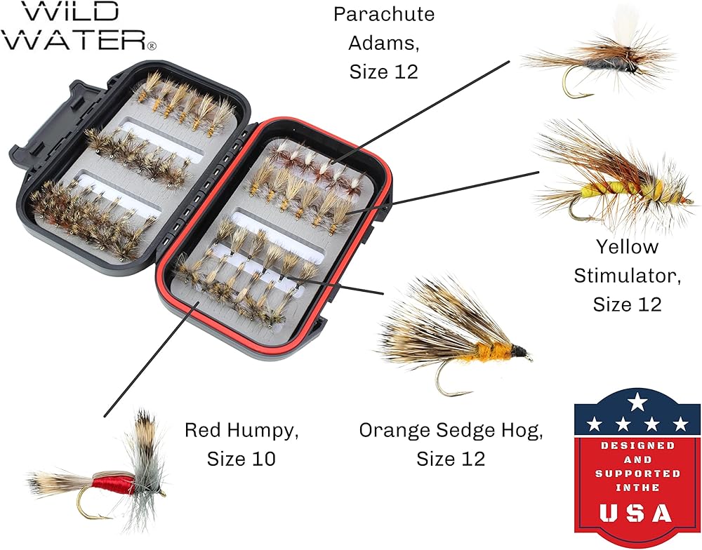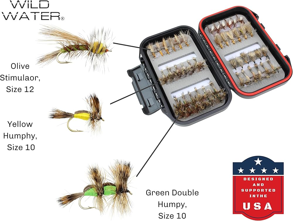 Wild Water is taking the guess work of selecting the right fly patterns to use!! This Attractor/Trout Stimulator Assortment is sure to give you a fly pattern that will get that fish!! We take our Small Fly Box and load it with 7 different fly patterns, you will get a total of 6 of each of the following patterns: Royal Wullf, size 14, Orange Sedge Hog, size 12, Orange Stimulator, size 14, Royal Stimulator, size 14, Parachute Adams, size 16, Yellow Humpy, size 10 and Red Double Humpy, size 10.
