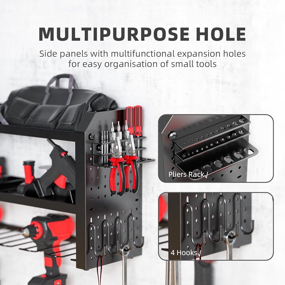 تطبيقات متعددة: رف تخزين الأدوات مناسب لتنظيم مجموعة متنوعة من الأدوات والملحقات، بما في ذلك المثقاب والمفكات والكماشة والمطارق والمزيد. يمكن أن تساعدك في الحفاظ على تنظيم ورشة العمل أو المرآب الخاص بك.