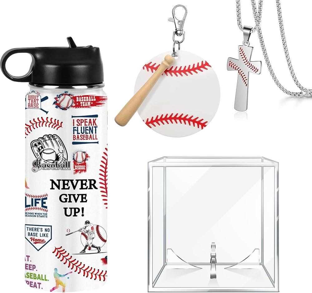 • ⚾Baseball Theme Design - Our baseball gifts set are designed with simple and stylish baseball elements so that you can use them in your daily life. The tumbler, keychain, and necklace all have baseball theme prints on them, acrylic clear display cases can be used to display your collection of autographed baseball.