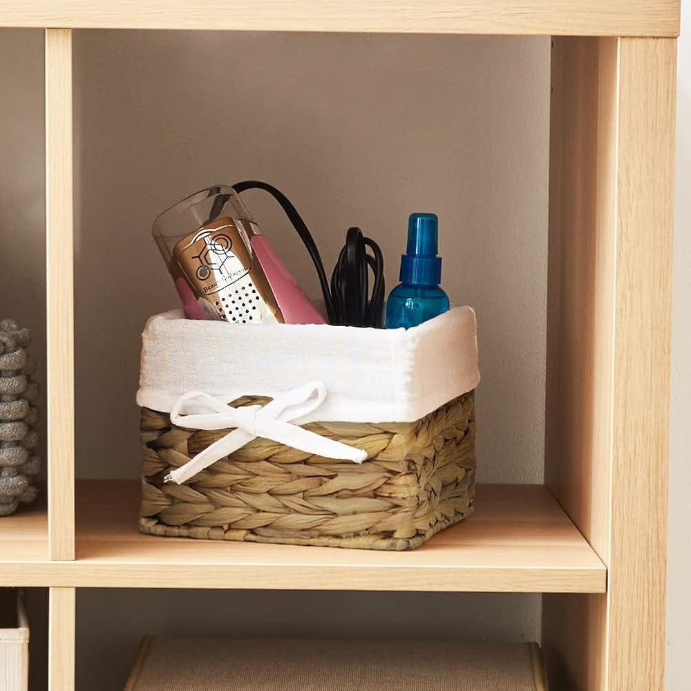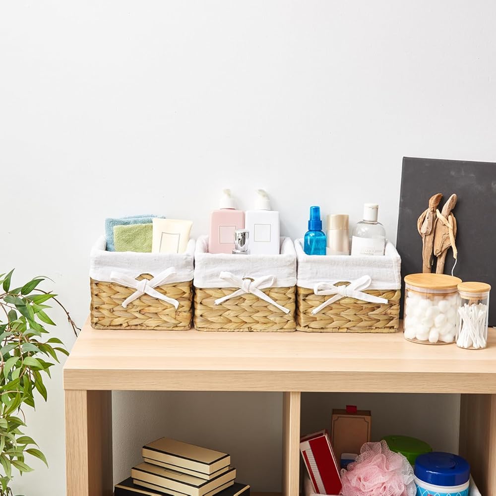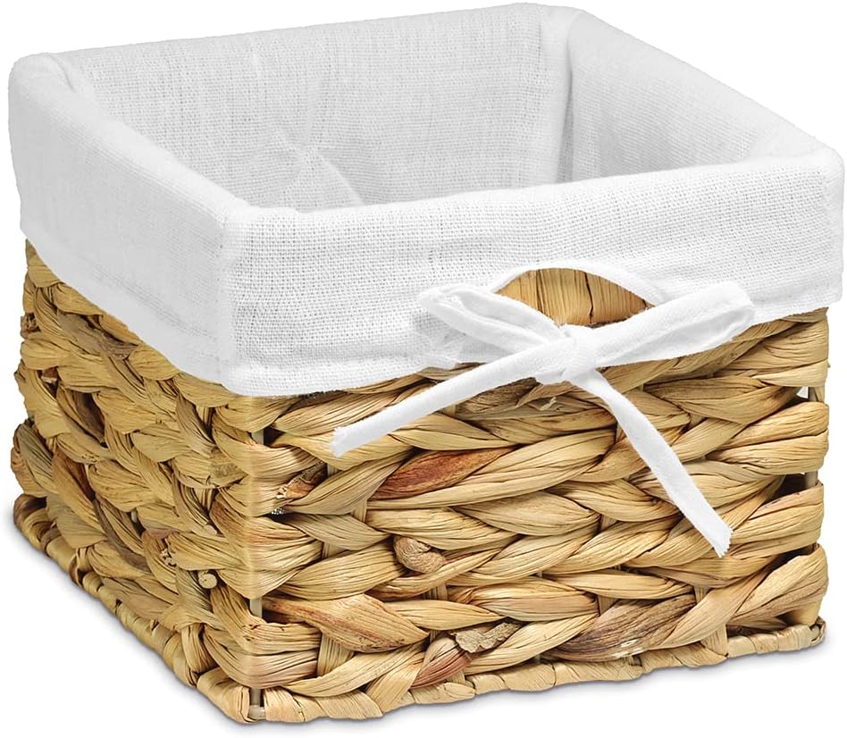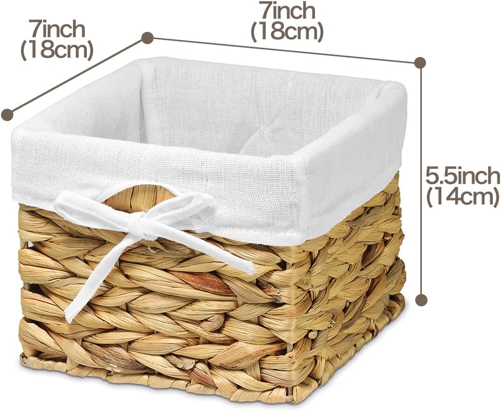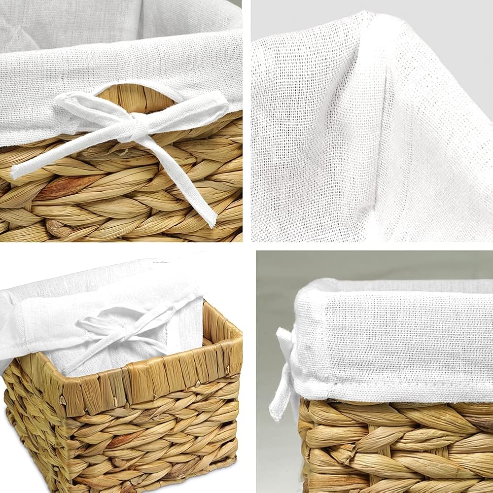 [ديكور منزلي جذاب] سلال مربعة الشكل بلون أبيض محايد مع بطانات بيضاء. تصميم يبدو رائعًا ويضيف لمسة ريفية بسيطة مع التطبيق العملي الحديث - مصنوع من حبل ورقي رمادي منسوج فوق إطار معدني وبطانة قابلة للإزالة.