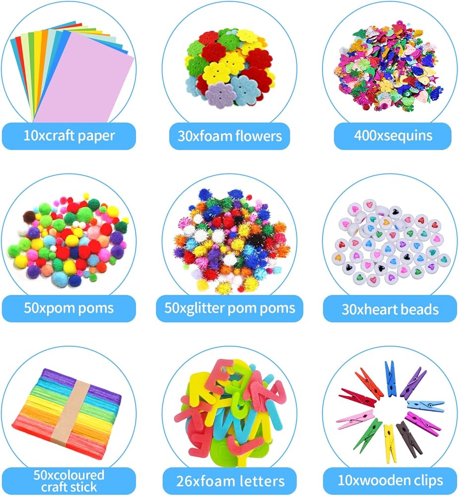 • Materials included cleaners, colorful popsicle sticks, craft matchsticks, buttons, adhesive googly eyes, assorted size pom poms, craft feathers, foam sticker shapes