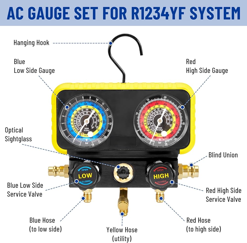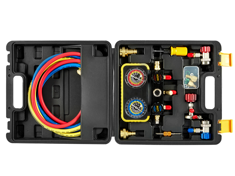 مجموعة قياس التيار المتردد: مجموعة قياس متعددة لتشخيص تكييف الهواء الاحترافية لثلاجات R1234YF R134A R404A. مصممة لشحن التيار المتردد والفحص التشخيصي وأعمال الاسترداد والإخلاء.