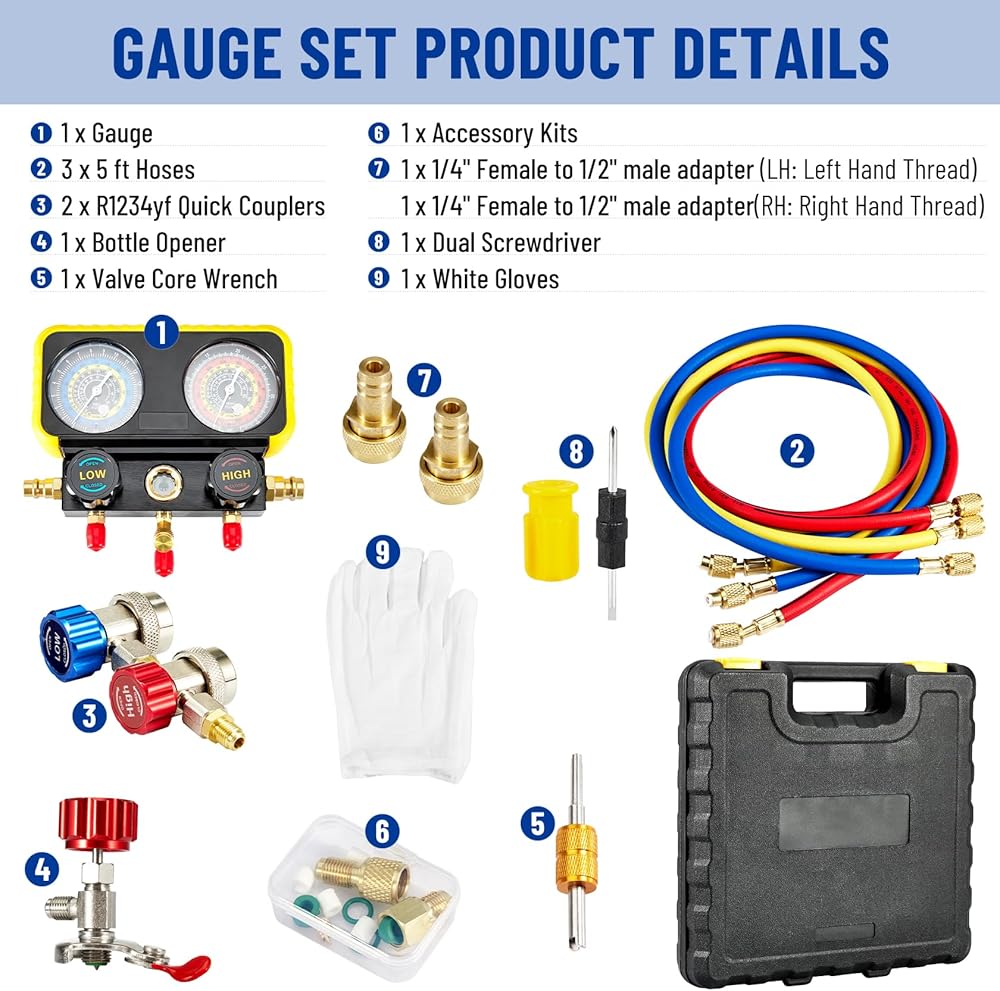تتضمن العبوة: 1 * مقياس؛ 3 خراطيم مرمزة بالألوان؛ زوج واحد من قارنات التوصيل السريعة 134a القابلة للتعديل؛ زوج واحد من محولات لاند روفر؛ 1 * فتاحة زجاجات عالمية؛ 1 * مفتاح ربط أساسي للصمام؛ 1 * مفك البراغي. 1 * طقم تصليح؛ 1 زوج من القفازات البيضاء