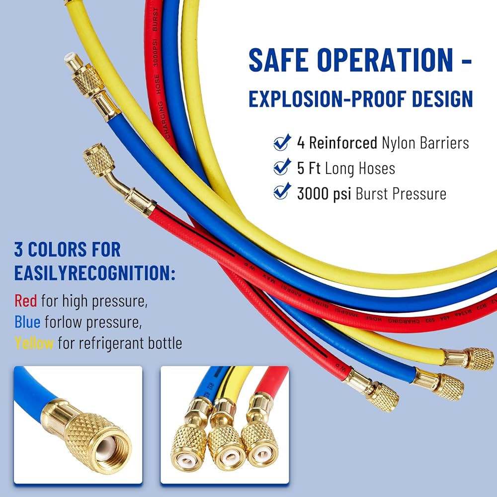 خرطوم شحن بطول 5 أقدام: 3 ألوان لسهولة التعرف عليها، أحمر للضغط العالي، أزرق للضغط المنخفض، أصفر لزجاجة التبريد. أقصى ضغط للخرطوم هو 600-3000 رطل لكل بوصة مربعة