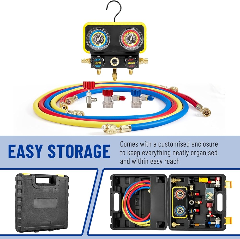 تطبيق واسع: مجموعة قياس المنوع مثالية لكل من الصيانة اليدوية والاحترافية لصيانة التدفئة والتهوية وتكييف الهواء (HVAC)، فهي تسمح لك بقياس ضغط النظام الخاص بك، وإخلاء المبرد وإعادة ملئه، وأكثر من ذلك