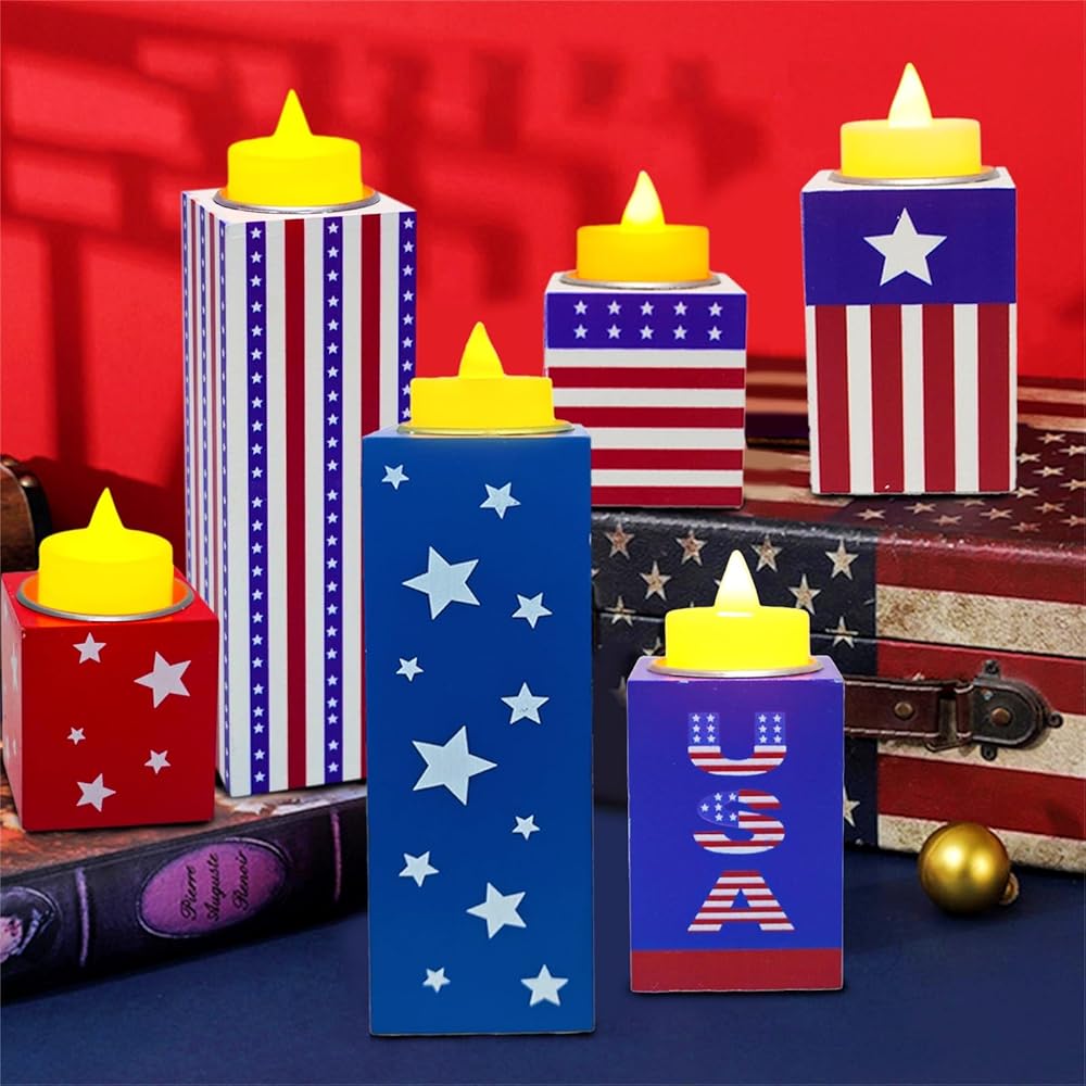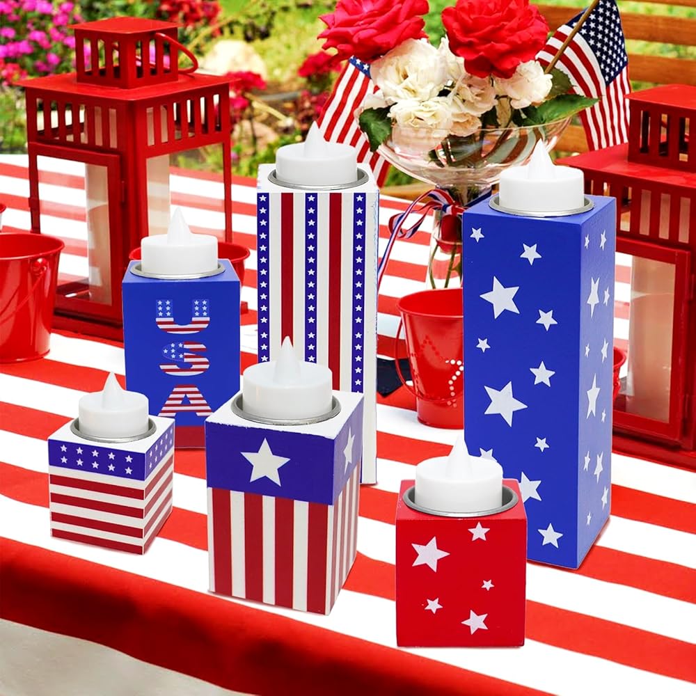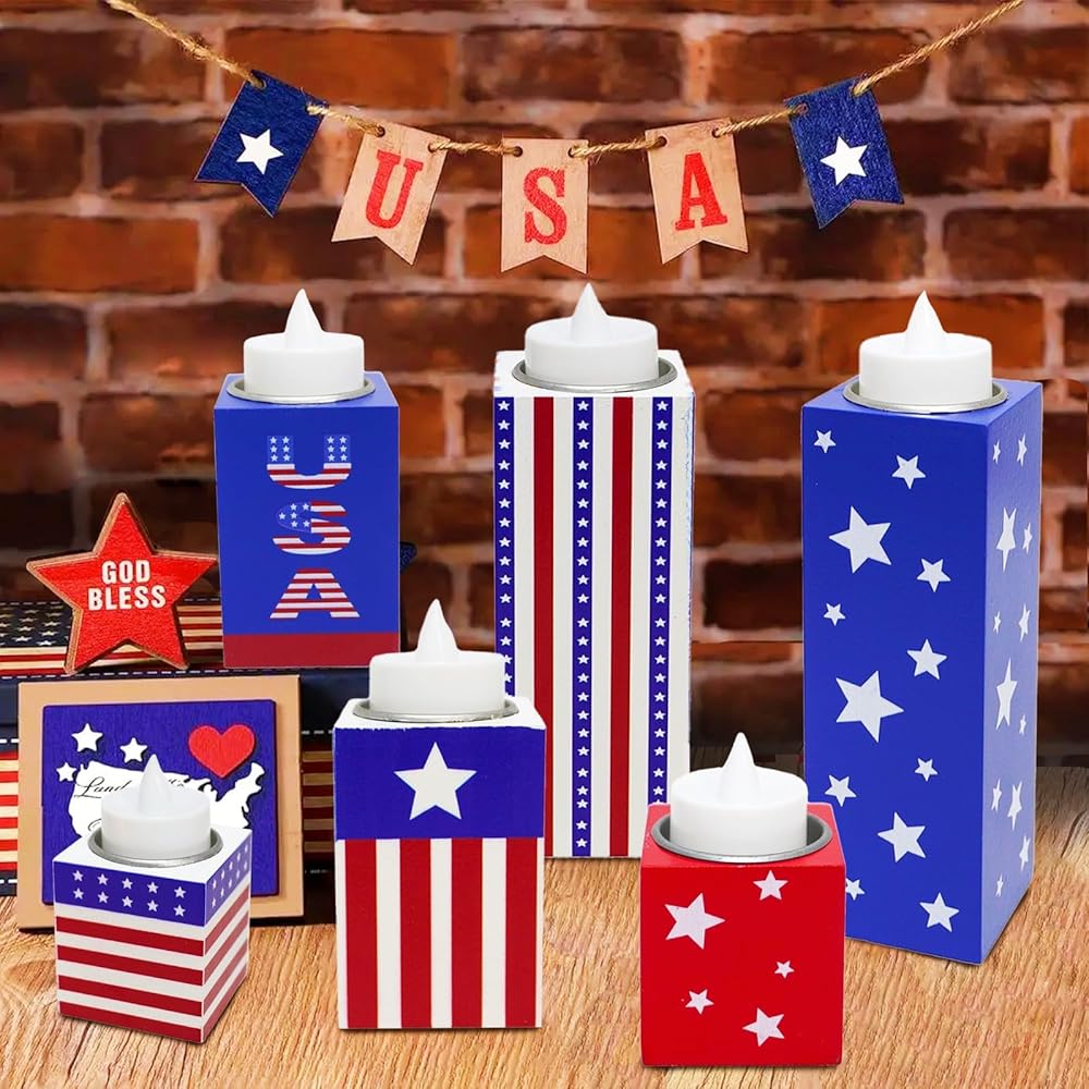 6 قطع من ديكورات الرابع من يوليو، حاملات شموع خشبية وطنية مع أضواء الشاي، صينية متدرجة من الرابع من يوليو، علامات طاولة لتزيين يوم الاستقلال ويوم الذكرى وديكور المزرعة الريفية
