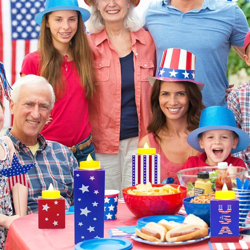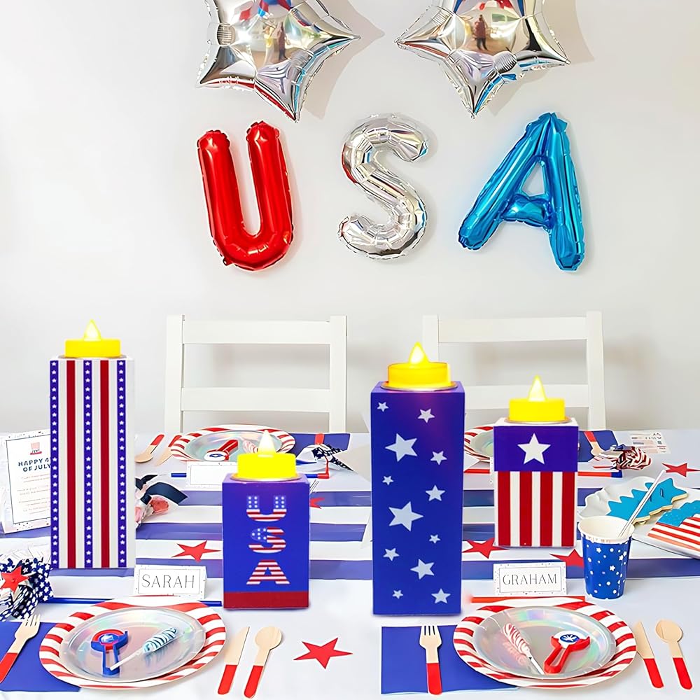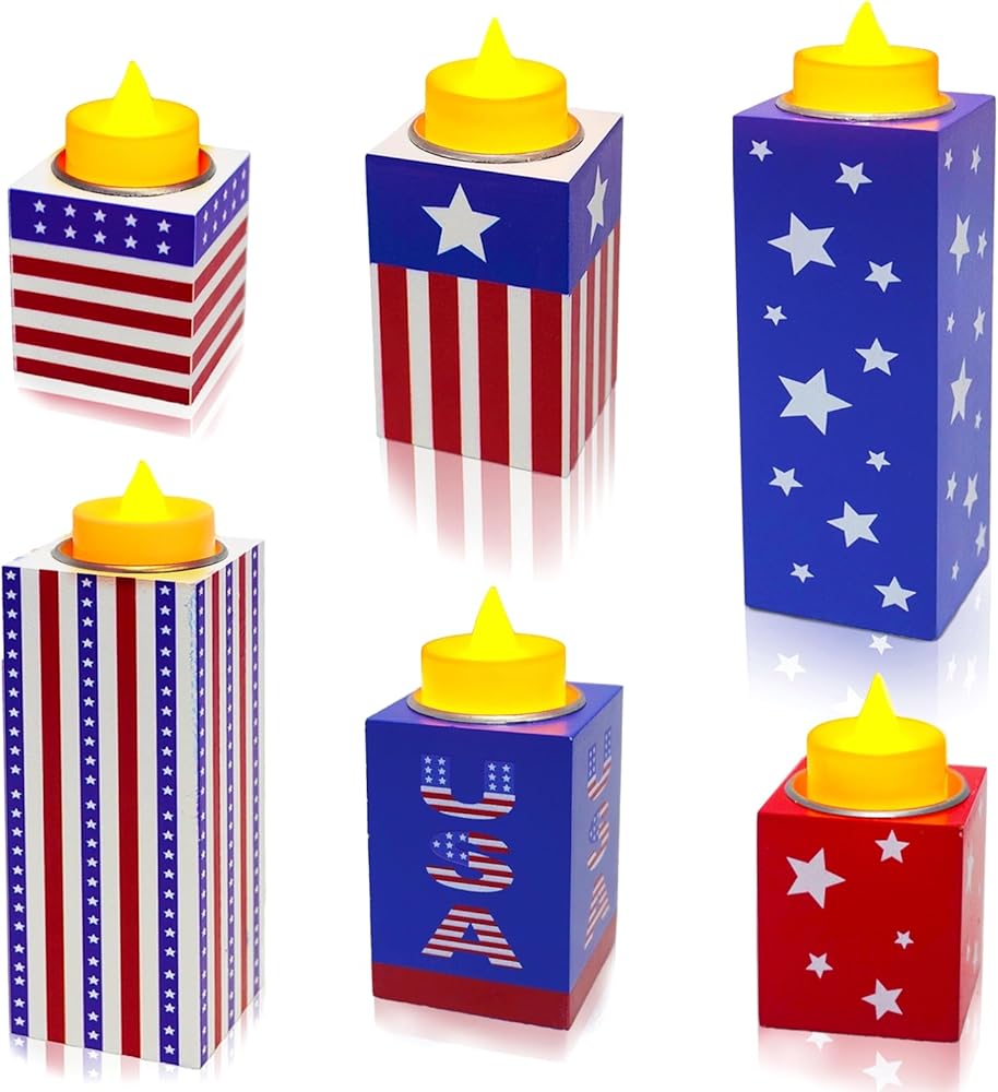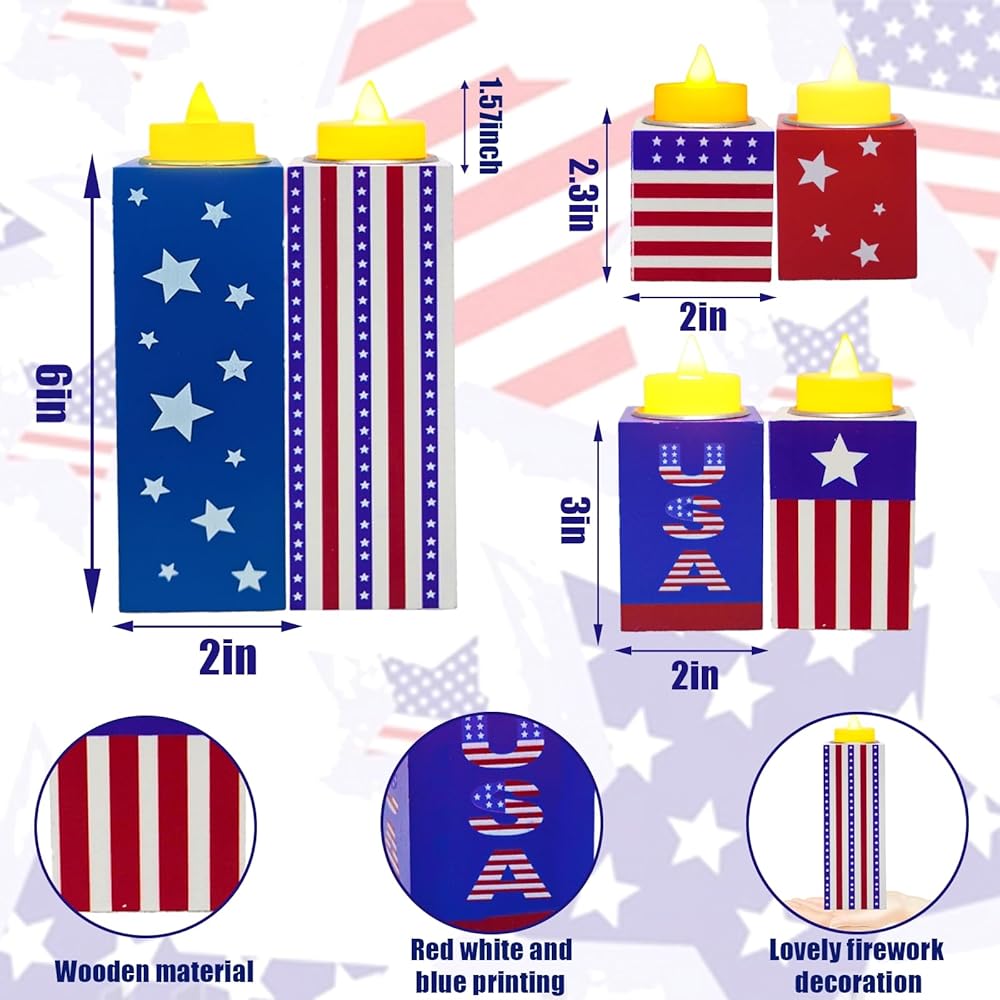 6 قطع من ديكورات الرابع من يوليو، حاملات شموع خشبية وطنية مع أضواء الشاي، صينية متدرجة من الرابع من يوليو، علامات طاولة لتزيين يوم الاستقلال ويوم الذكرى وديكور المزرعة الريفية