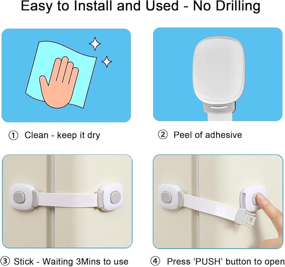 💧 أقفال خزانة أمان الأطفال سهلة التركيب: شريط لاصق قوي من الدرجة الصناعية على جانبي قفل خزانة أمان الأطفال، لا حاجة إلى برغي حفر أو أي أدوات خاصة! حتى تتمكن من تركيبها وإزالتها في غضون ثوانٍ، دون التسبب في أي ضرر أو تلف أو ترك أي علامات على الأثاث الخاص بك. وأقفال أحزمة أمان الأطفال سهلة الاستخدام للبالغين ولكن يكاد يكون من المستحيل على الأطفال اكتشافها - حتى لو استطاعوا ذلك، فإنهم يفتقرون إلى قوة الإصبع للضغط على الأزرار بسهولة.
