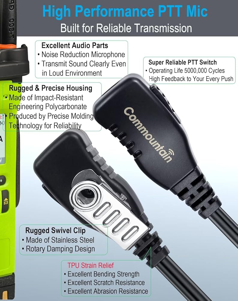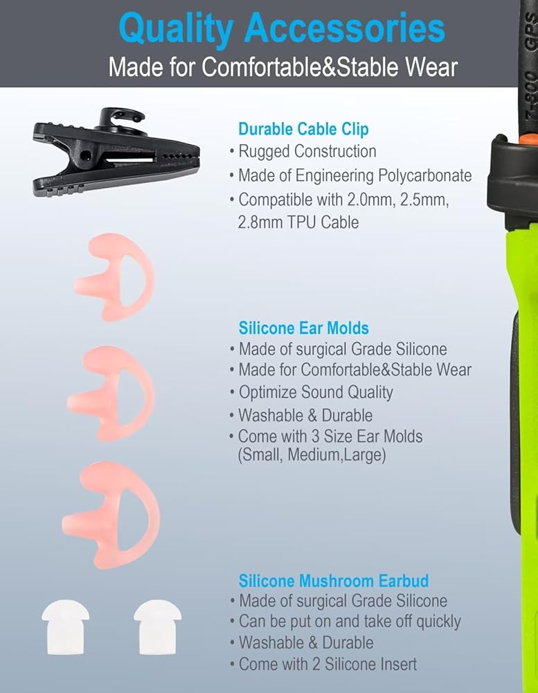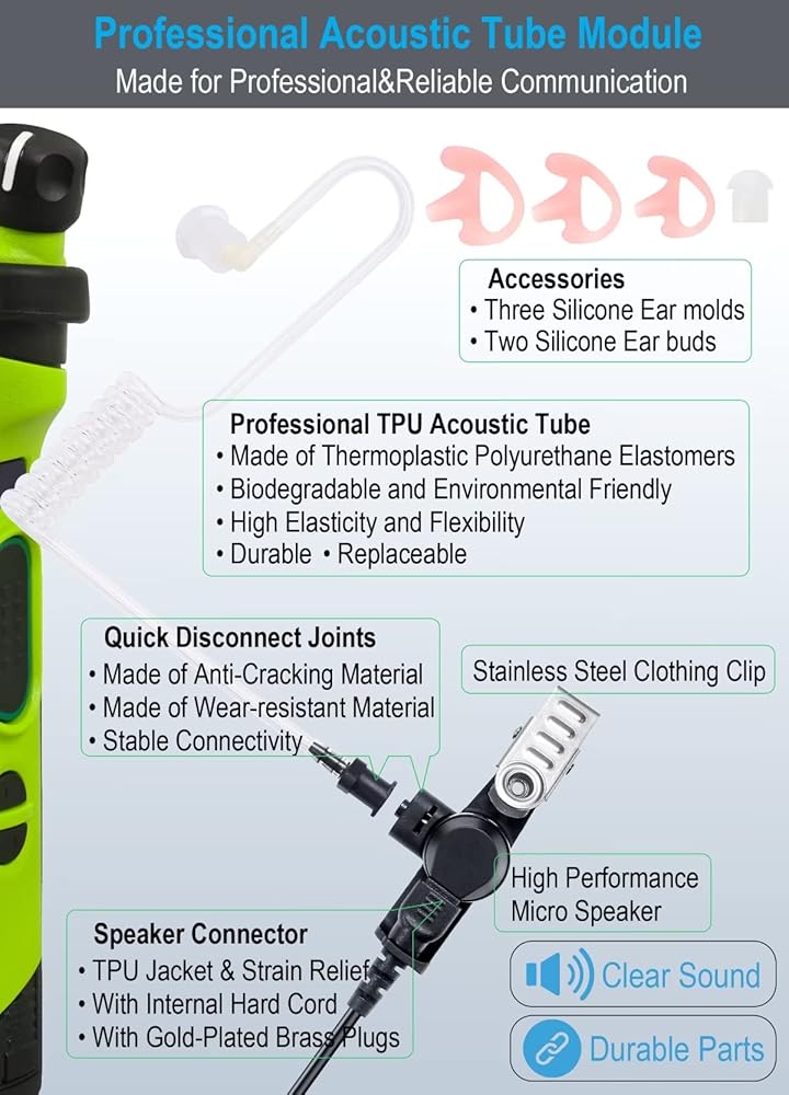 Clear Sound Transmission: With professional acoustic tube module, high quality micro speaker, noise reduction microphone, high purity copper wire cable and anti-Interference circuit design and our great assembly skills, this earpiece ensure sound to be received and transmitted clearly even in loud environment.