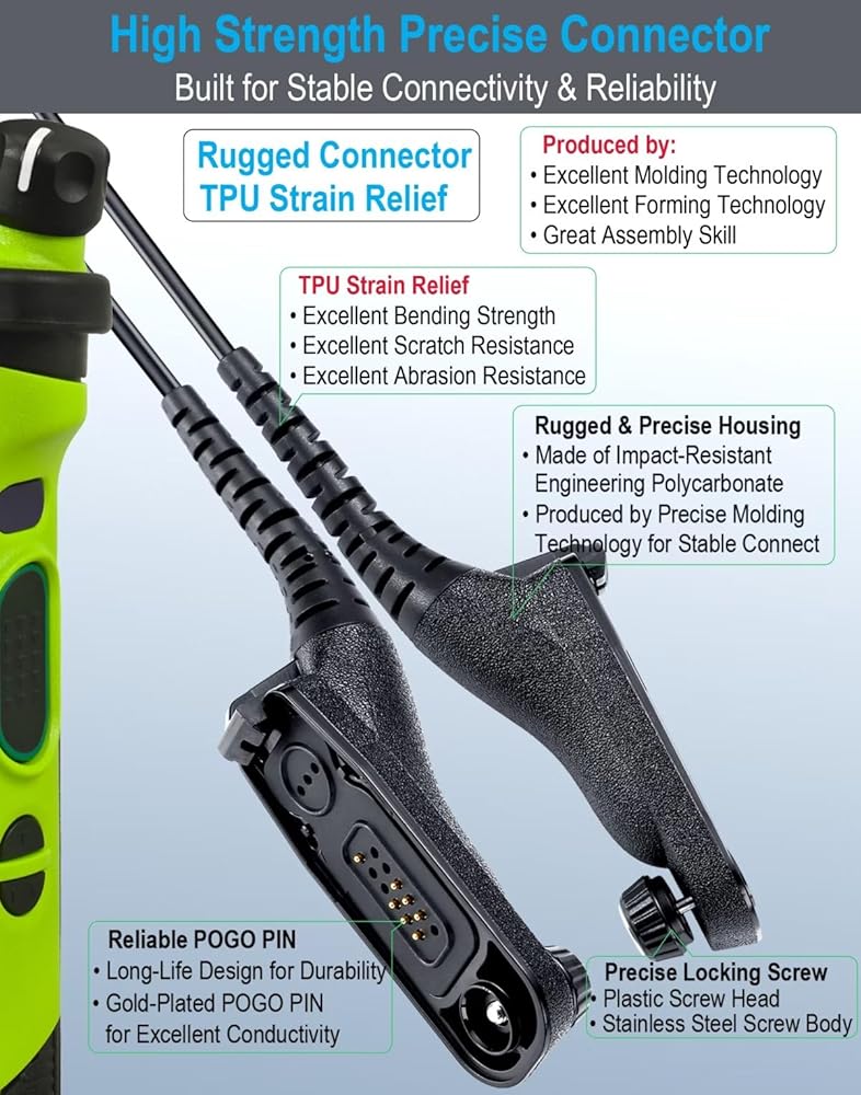 High Strength Precise Connector: With TPU (Thermoplastic polyurethane) rubber jacket, engineering Polycarbonate housing, internal hard core and gold-plated POGO-pin, assembled by precise soldering technology and molding technology, the connector of this earpiece is built for stable connectivity and excellent operating life.
