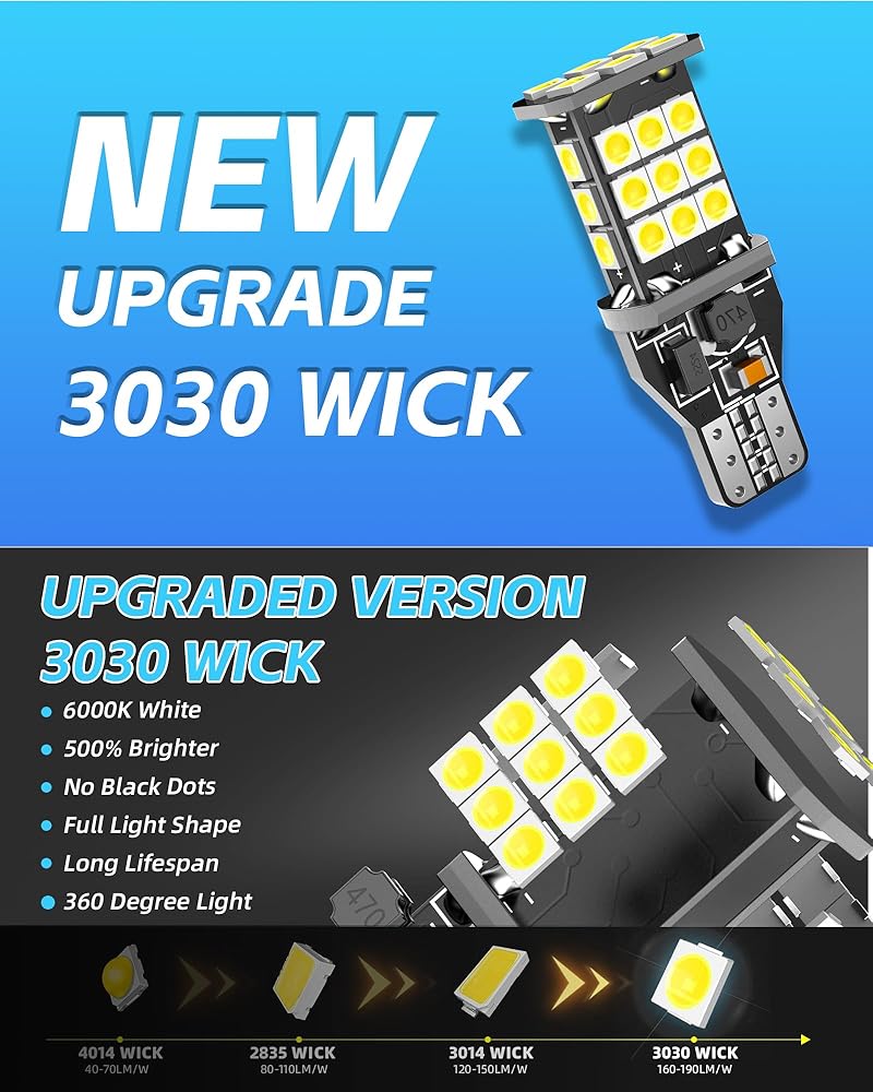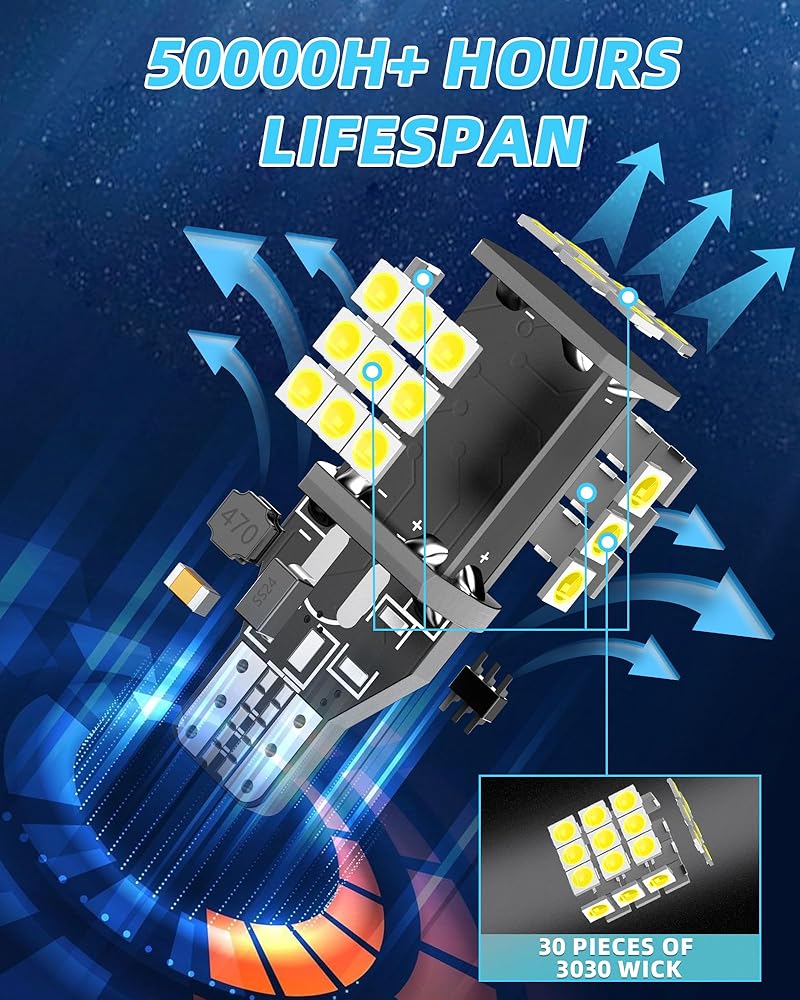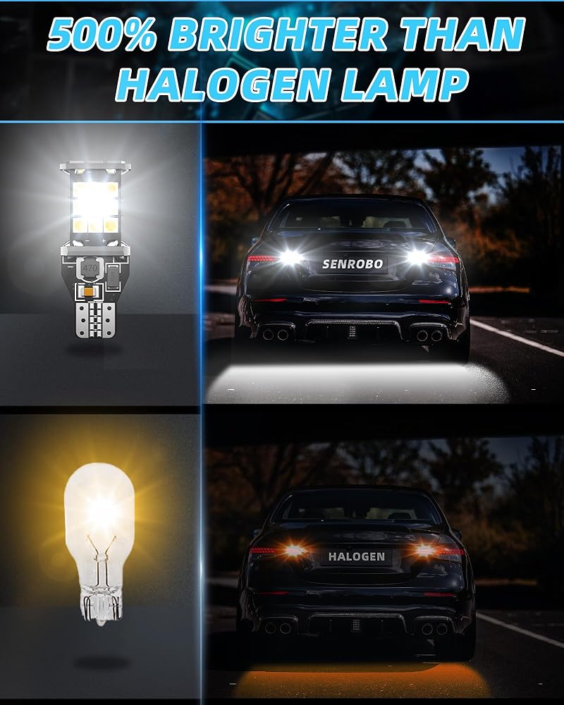 【أكثر سطوعًا بنسبة 500% من ضوء الهالوجين】تم تصميم لمبة SENROBO 912/921 LED مع شرائح 30-SMD 3030 (في الوقت الحاضر، لا يوجد سوى 24 خرزة مصباح كحد أقصى في السوق تستخدم 3030 منتج فتيل)، قادرة على انبعاث 2200LM ، وهو أكثر سطوعًا بخمس مرات من مصابيح الهالوجين. كما أنه يدعم إضاءة بزاوية كاملة 360 درجة، مع مسافة إضاءة أوسع وأبعد