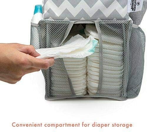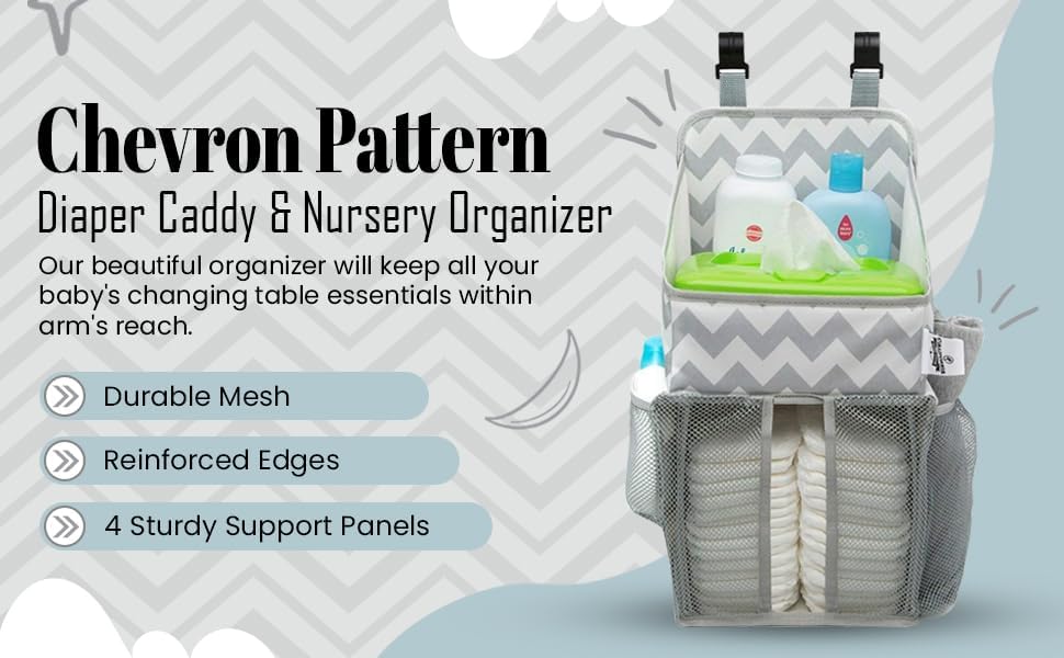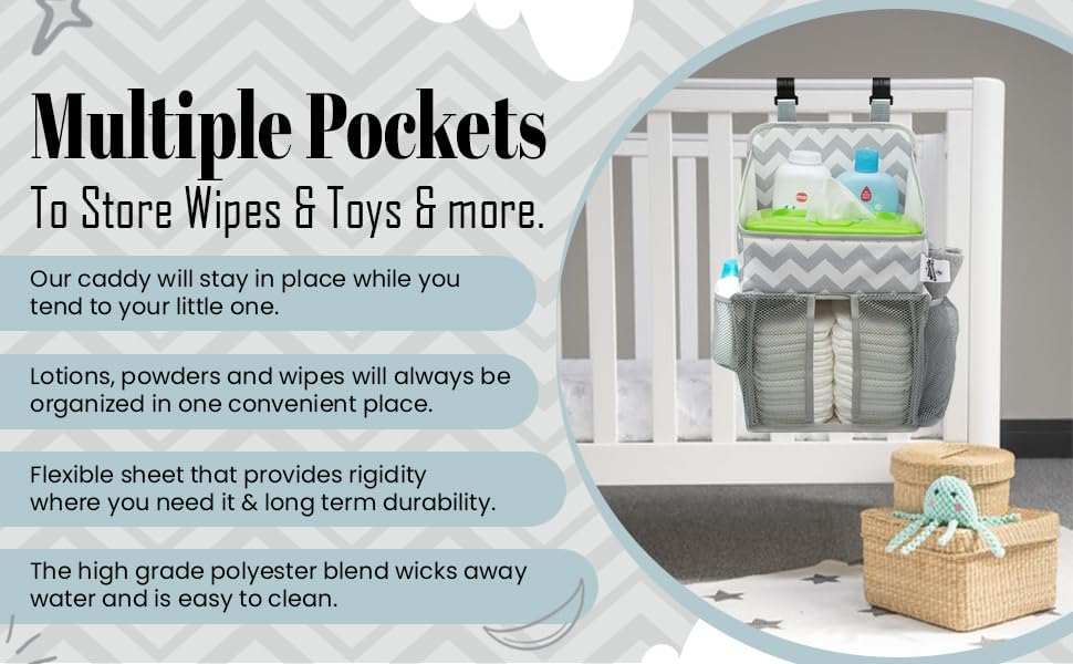 DESIGN MEETS FUNCTION: Our beautiful organizer will keep all your baby's changing table essentials within arm's reach. The left side has two 4.5" x 4.5" mesh pockets while the right side offers a larger 9" x 8.5" mesh pocket. The top compartment measures 7.5" x 7" and the spacious diaper compartment measures 8.5" x 9" THREAD FROM A DIFFERENT FABRIC: Don't fall victim to flimsy organizers that sag! We set out to create a nursery caddy that works as hard as you do! It utilizes a lightweight and flexible sheet that provides rigidity where you need it and long term durability. The high grade polyester blend wicks away water and is easy to clean. KEEPS ALL BABY ESSENTIALS AT YOUR FINGERTIPS: Your diapers, lotions, powders and wipes will always be organized in one convenient place. EFFORTLESSLY ATTACHES TO ALL CHANGING TABLES, DRESSERS OR CRIBS: Durable plastic hanging hooks ensure that our caddy will stay in place while you tend to your little one.