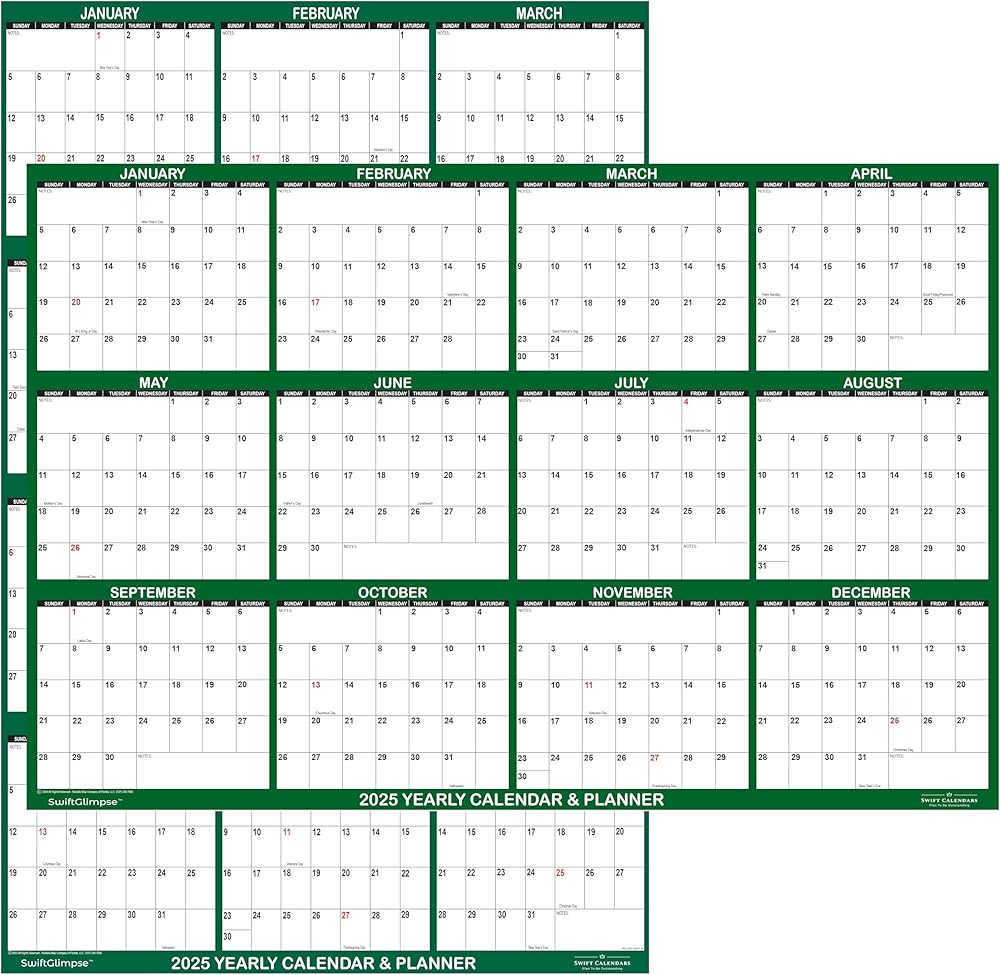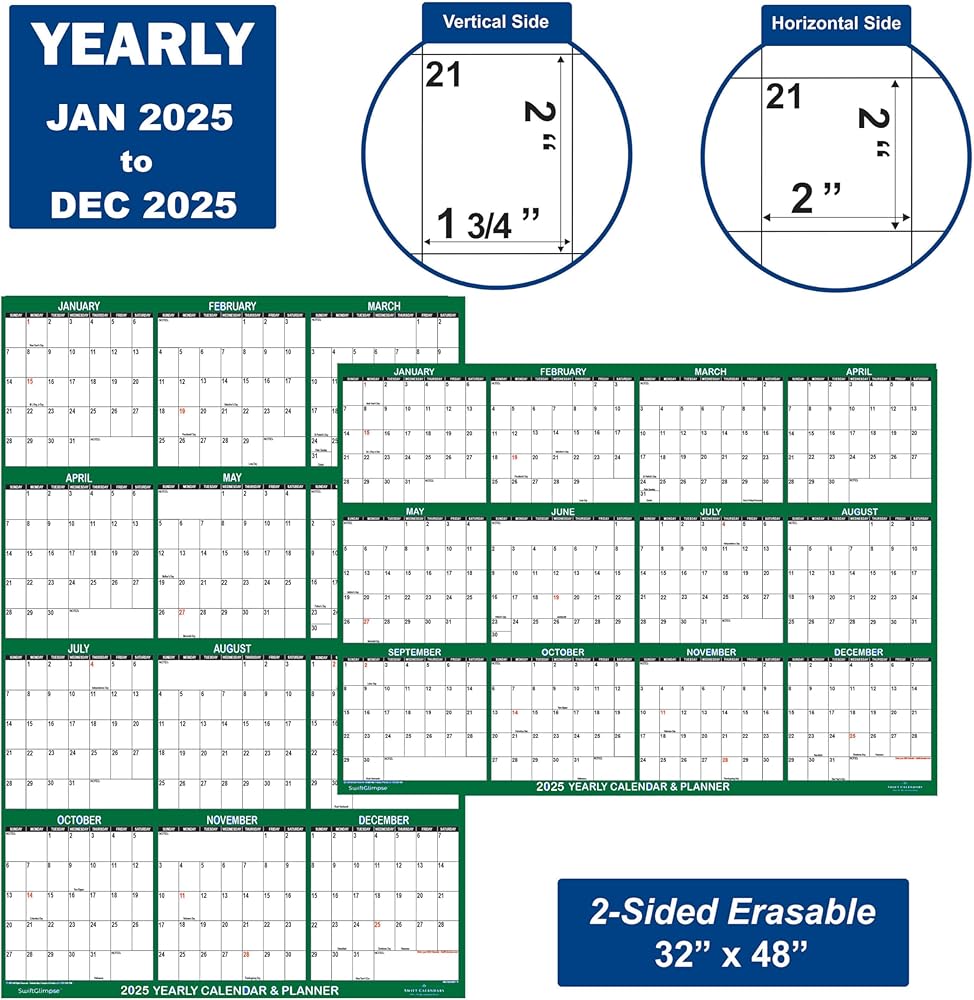 كتل تقويمية كبيرة لعام 2025: يتميز كل تقويم جداري بمكعبات كبيرة للجدولة والملاحظات. الكتل الجانبية الرأسية 2 × 1.75 بوصة - الكتل الجانبية الأفقية 2 × 2 بوصة. طباعة جريئة وكبيرة بخلفية بيضاء ساطعة تسمح بسهولة المشاهدة والقراءة في لمحة واحدة.
