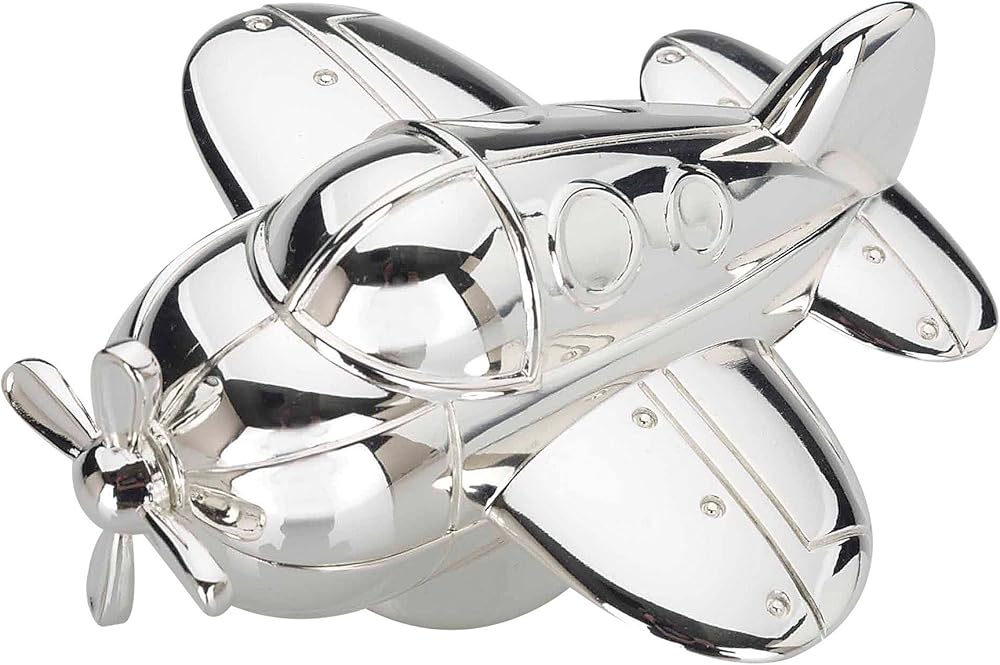 This silverplate coin bank is shaped like an old-fashioned propeller plane and is perfect for a little one learning to save. The propeller turns and the bank rocks on its landing gear for a quaint touch. Part of the Zoom Zoom Collection.