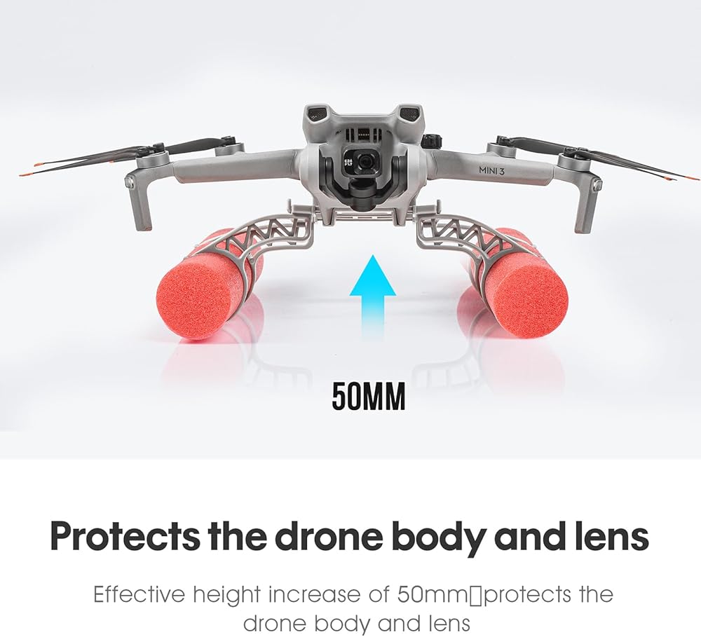• 【Landing Protection】The drone landing gear can increase the height by 2.1 centimeters, and the water landing gear legs can increase the height of the drone by 5cm, preventing scratches to the fuselage and gimbal.