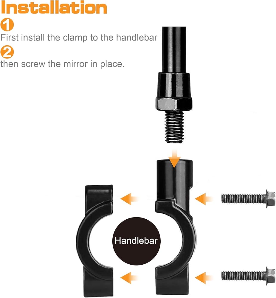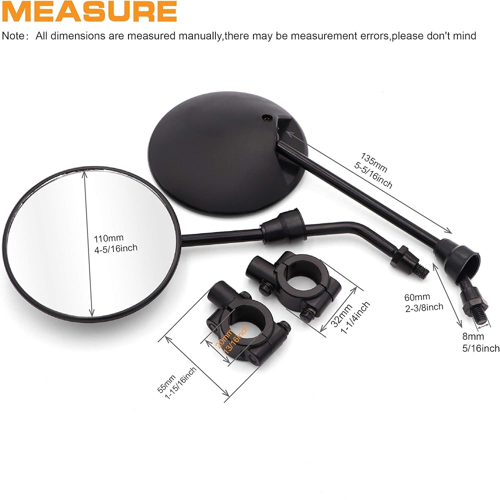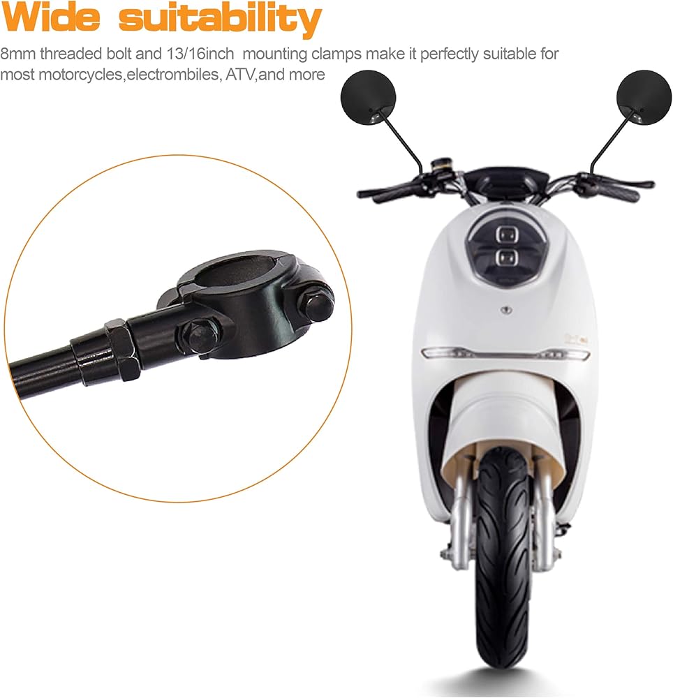 • سهلة التركيب: مع مسمار ملولب معزز مقاس 8 مم، يعتمد المقاس العالمي على ما إذا كانت ATV الخاصة بك تحتوي على مقود على شكل أنبوب (7/8 بوصة) أو إطار قفص لتثبيت مرآة الرؤية الخلفية