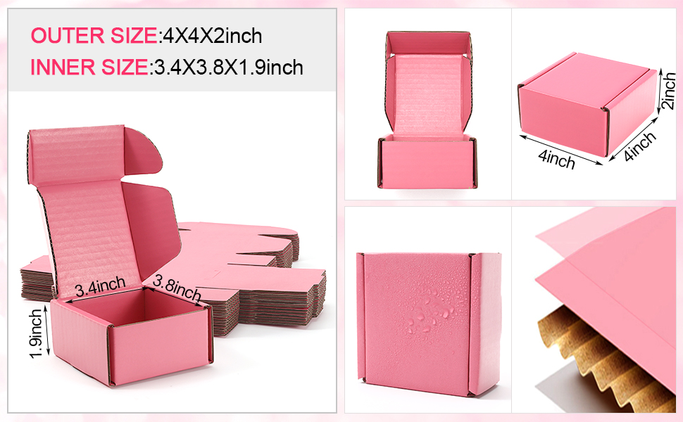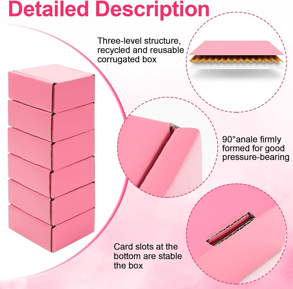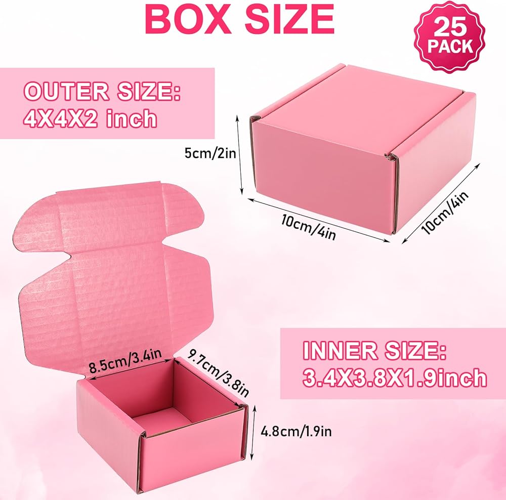 ✔️الأبعاد: 25 قطعة من صناديق الشحن الصغيرة في كل مجموعة، كمية كافية للاستخدام اليومي. الحجم الداخلي لصناديق الشحن الوردية لدينا هو 3.4 × 3.8 × 1.9 بوصة (طول × عرض × ارتفاع)، والحجم الخارجي 4 × 4 × 2 بوصة. حجم مناسب لتعبئة وشحن العناصر الصغيرة والهدايا الصغيرة والمزيد.