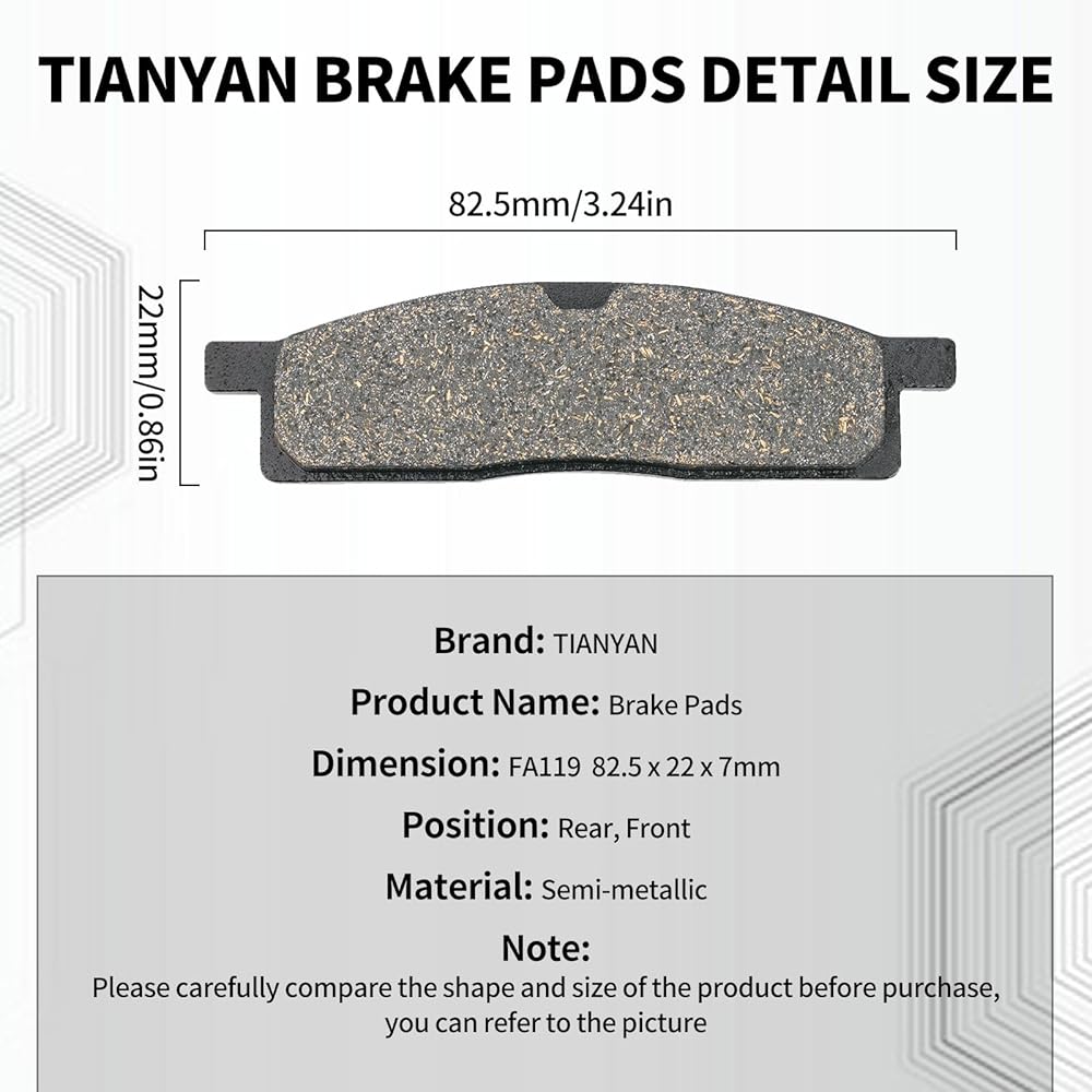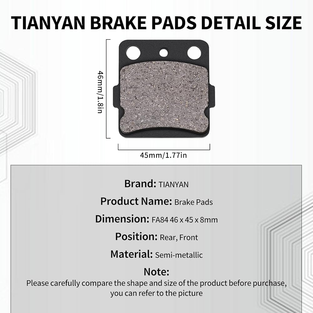 • أبعاد وسادات الفرامل الأمامية والخلفية من تيانيان: FA84: 46 × 45 × 8 مم، FA119: 82.5 × 22 × 7 مم؛ الموقف: خلفي، أمامي؛ المواد: شبه معدني؛ تتضمن العبوة: زوجان من وسادات الفرامل، كما هو موضح في الصورة