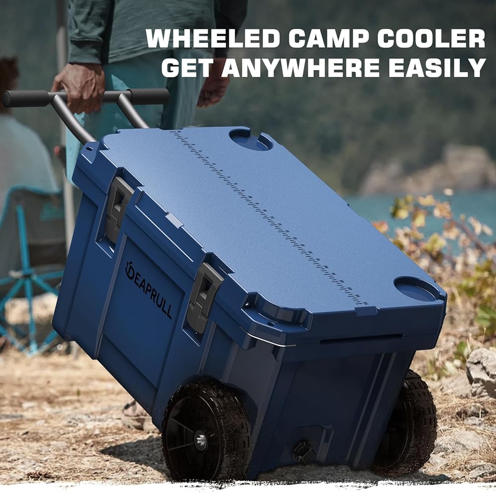 مبرد بسعة 55 لترًا مع عجلات، مبرد تخييم محمول بصناديق ثلج يحمل الثلج لمدة تصل إلى 6 أيام، مبرد معزول خارجي مانع للتسرب مع مقبض، حاملات أكواب، مبرد صلب للتخييم، التخييم، الشاطئ، القارب