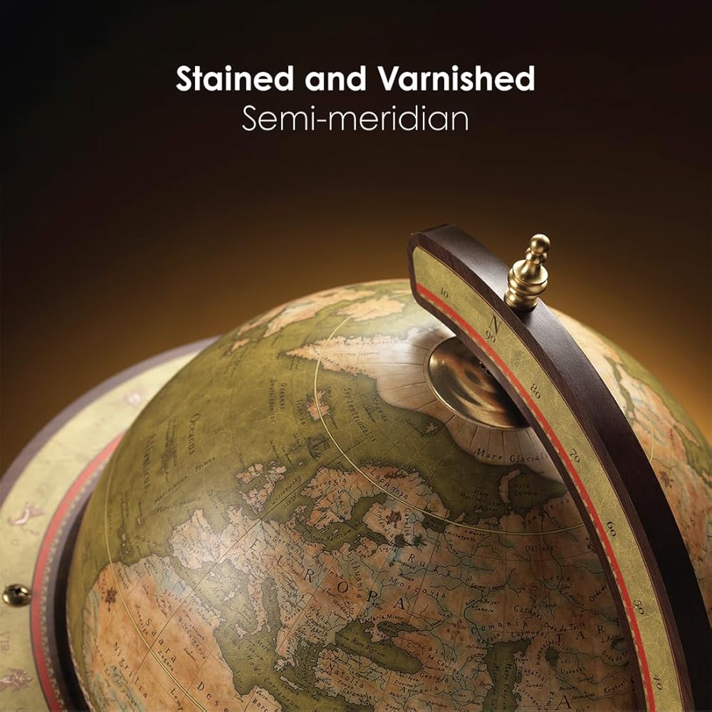 هيكل أنيق - يخلق الهيكل شبه الطولي، الملون والمطلي ليتناسب مع الحامل الأرضي، تباينًا جذابًا مع قسم يعكس اللون الأساسي لخريطة الكرة الأرضية. الحلقة الاستوائية مزينة بعلامات زودياك رائعة.