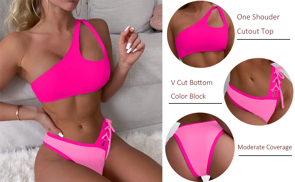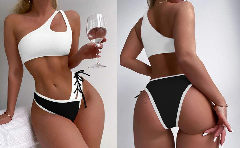 • قطعتان من البكيني الرياضي للسيدات، يتميز بفتحة علوية بكتف واحد وجزء سفلي مرتفع على شكل حرف V مع تصميم بأربطة، أكثر أناقة وإثارة.