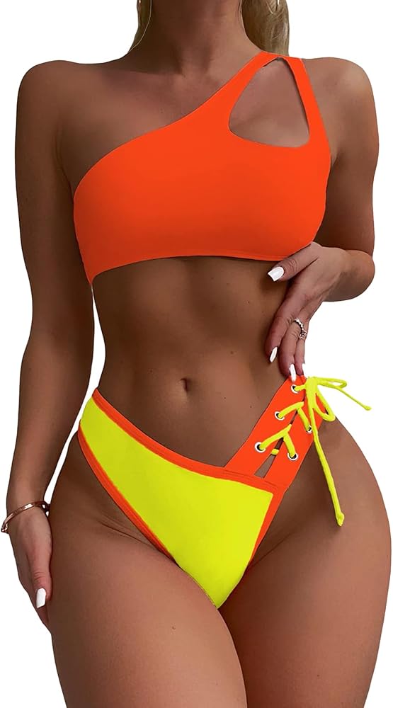 بدلة سباحة نسائية من SherryDC ذات فتحة واحدة بكتف واحد وبلون كتلة على شكل حرف V وساق عالية من قطعتين