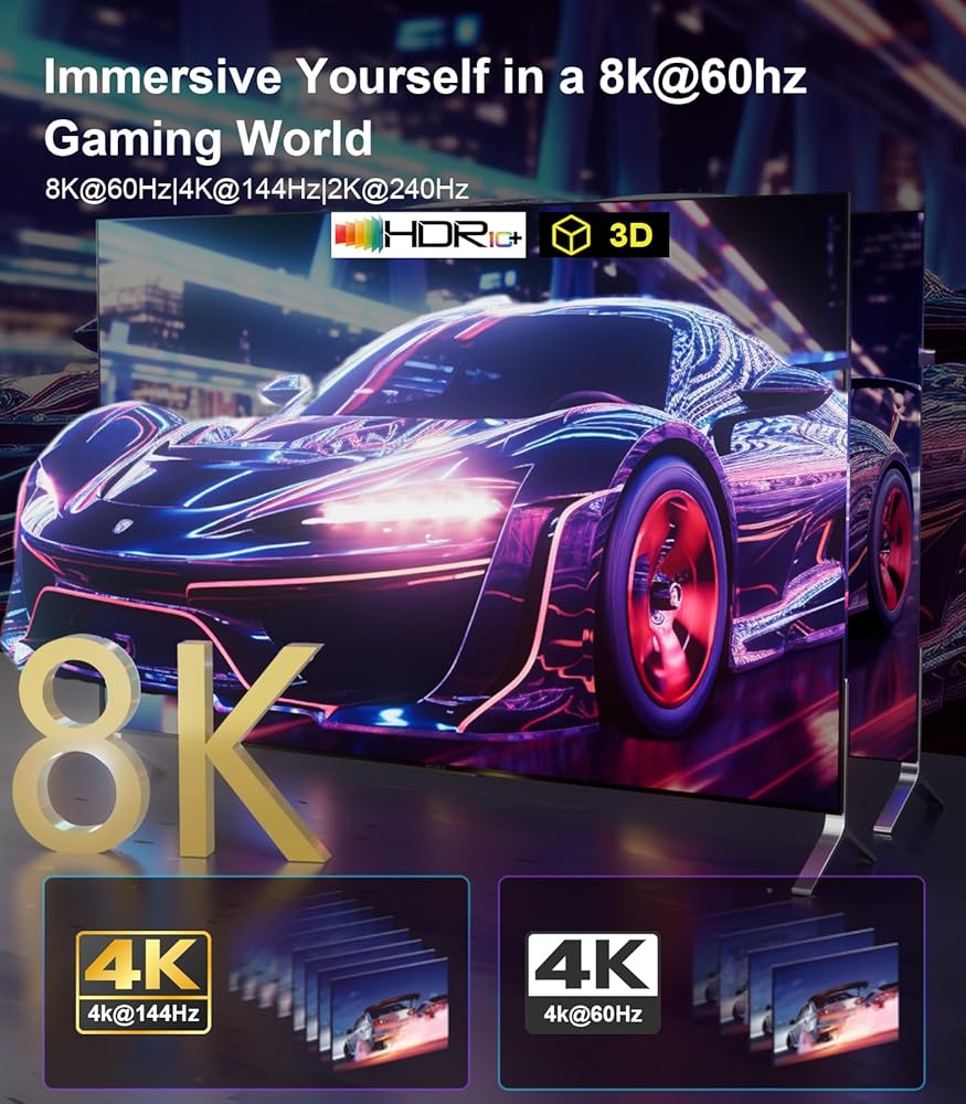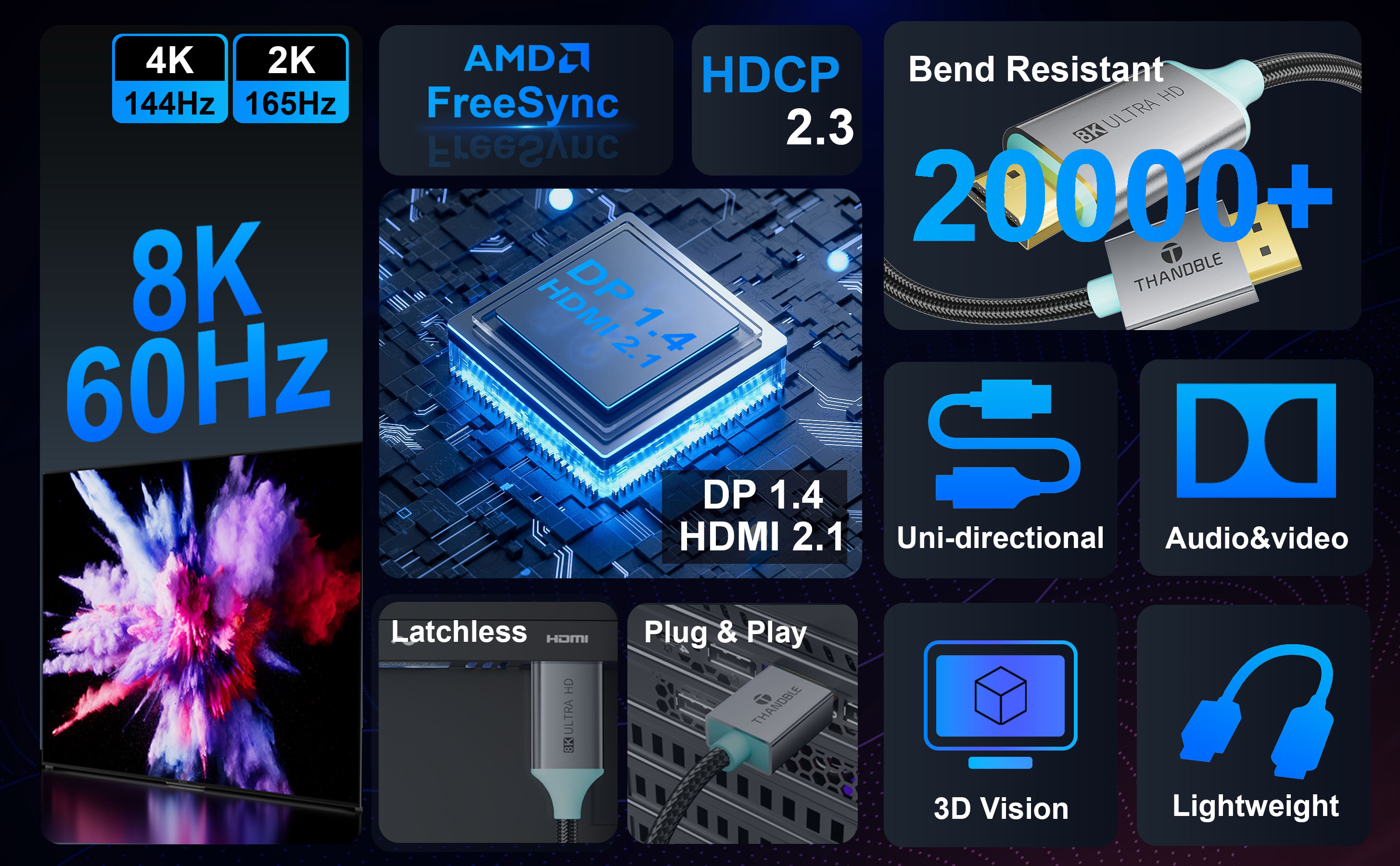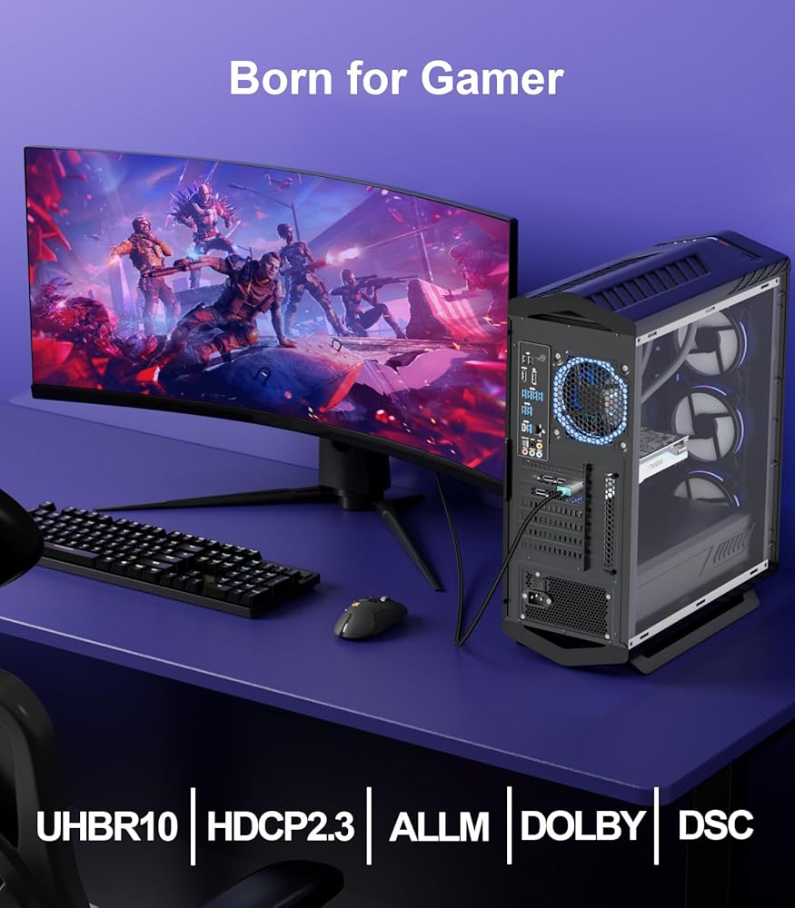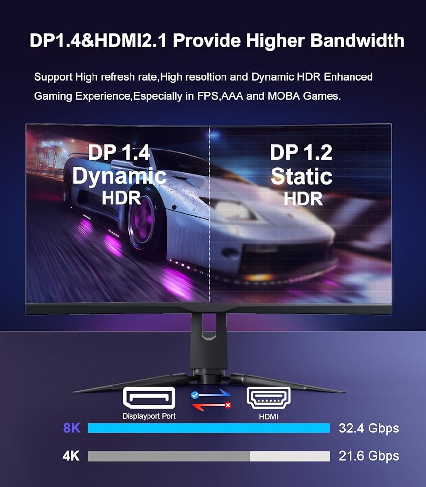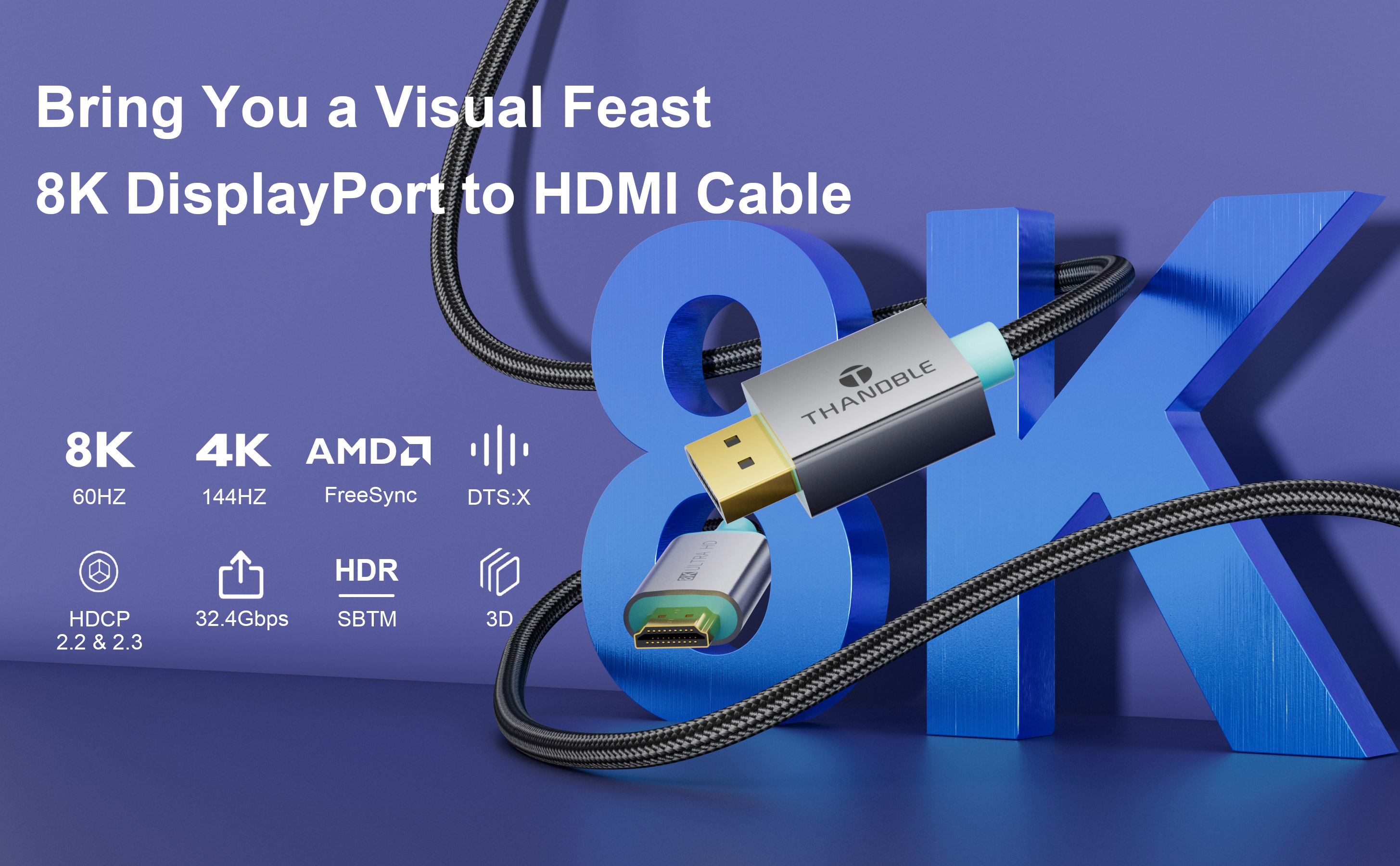 وليمة بصرية مثالية: بالمقارنة مع كابل 4K DP إلى HDMI، يوفر كابل 8K DP 1.4 إلى HDMI 2.1 عرض نطاق ترددي أعلى، ويدعم HBR3 عرض النطاق الترددي 32.4 جيجابت في الثانية، وضغط تدفق العرض (DSC)، بالإضافة إلى معدل تحديث عالي ودقة عالية لتحقيق أقصى قدر من الأداء من بطاقة الرسومات والشاشة. تعمل تقنية HDR الديناميكية على تحسين المناطق المظلمة وتعزيز التفاصيل في الألعاب، خاصة في عناوين FPS و3A، مع ألوان أكثر وضوحًا وأبعاد ثلاثية شبه عارية لتشغيل أكثر سلاسة ونعومة.