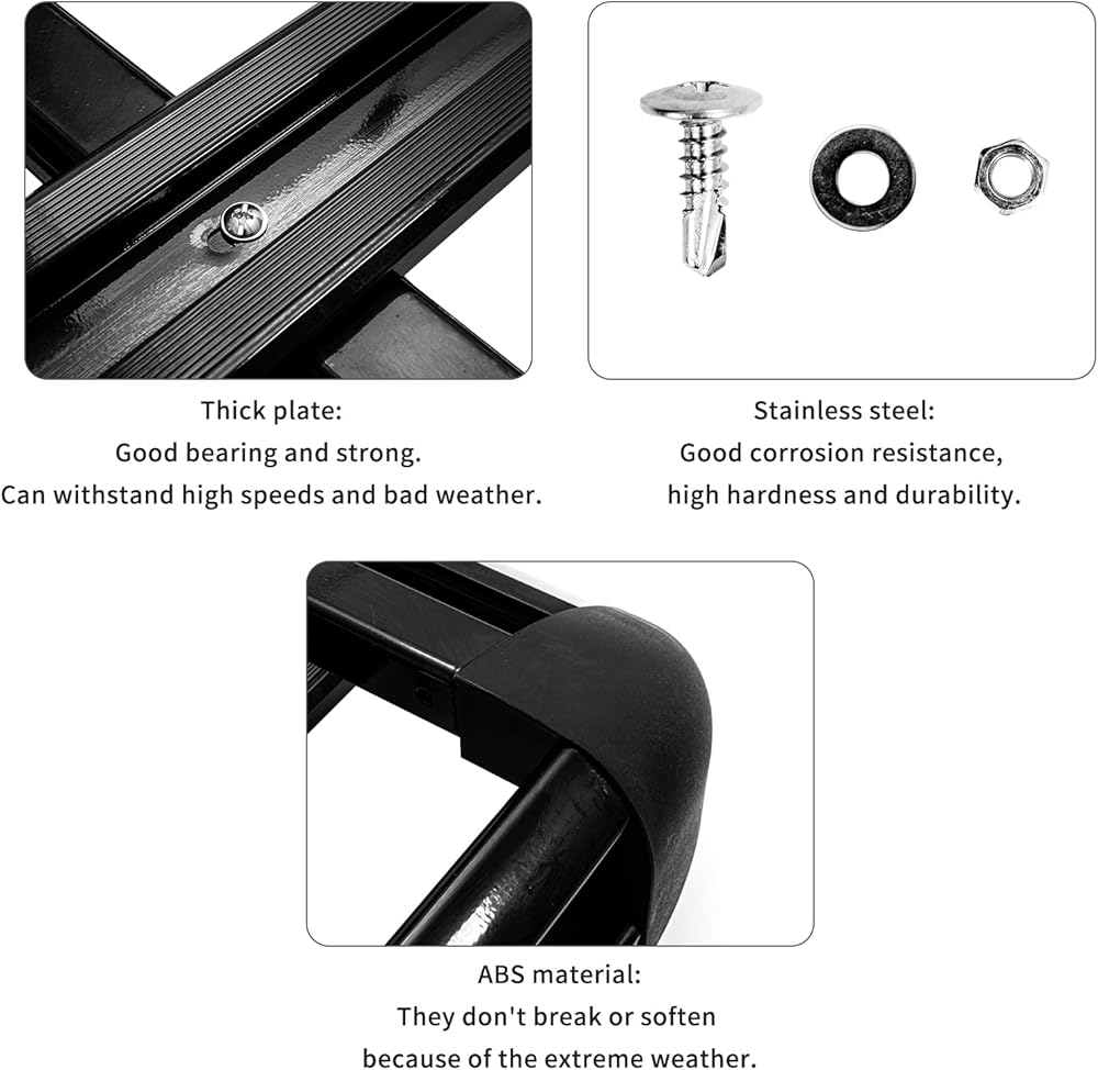 [هيكل متين]: رف السقف بالكامل مصنوع من مادة سبائك الألومنيوم عالية الجودة، والتي يمكن أن تتحمل 150 رطلاً وهي قوية بما فيه الكفاية. حاملة البضائع الموجودة على السطح مصنوعة من سبائك الألومنيوم، وهي أكثر مقاومة للصدأ والتآكل. إطالة عمر سلة حامل رف السقف بشكل فعال.