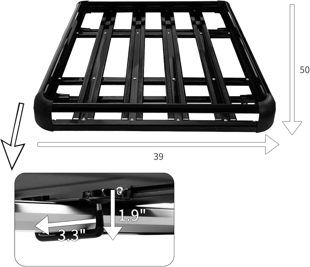 [سعة كبيرة جدًا وسياج مرتفع]: الأبعاد الإجمالية لرف الأمتعة هذا هي: 50 بوصة × 39 بوصة × 6 بوصة (الطول × العرض × الارتفاع) ويزن 21.6 رطل فقط، فهو خفيف الوزن ولكنه قوي. بالإضافة إلى ذلك، 6- سيحافظ السياج الذي يبلغ طوله بوصة على مستلزماتك من السقوط والتسبب في وقوع حوادث.