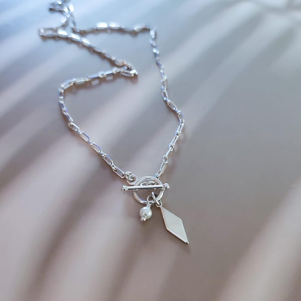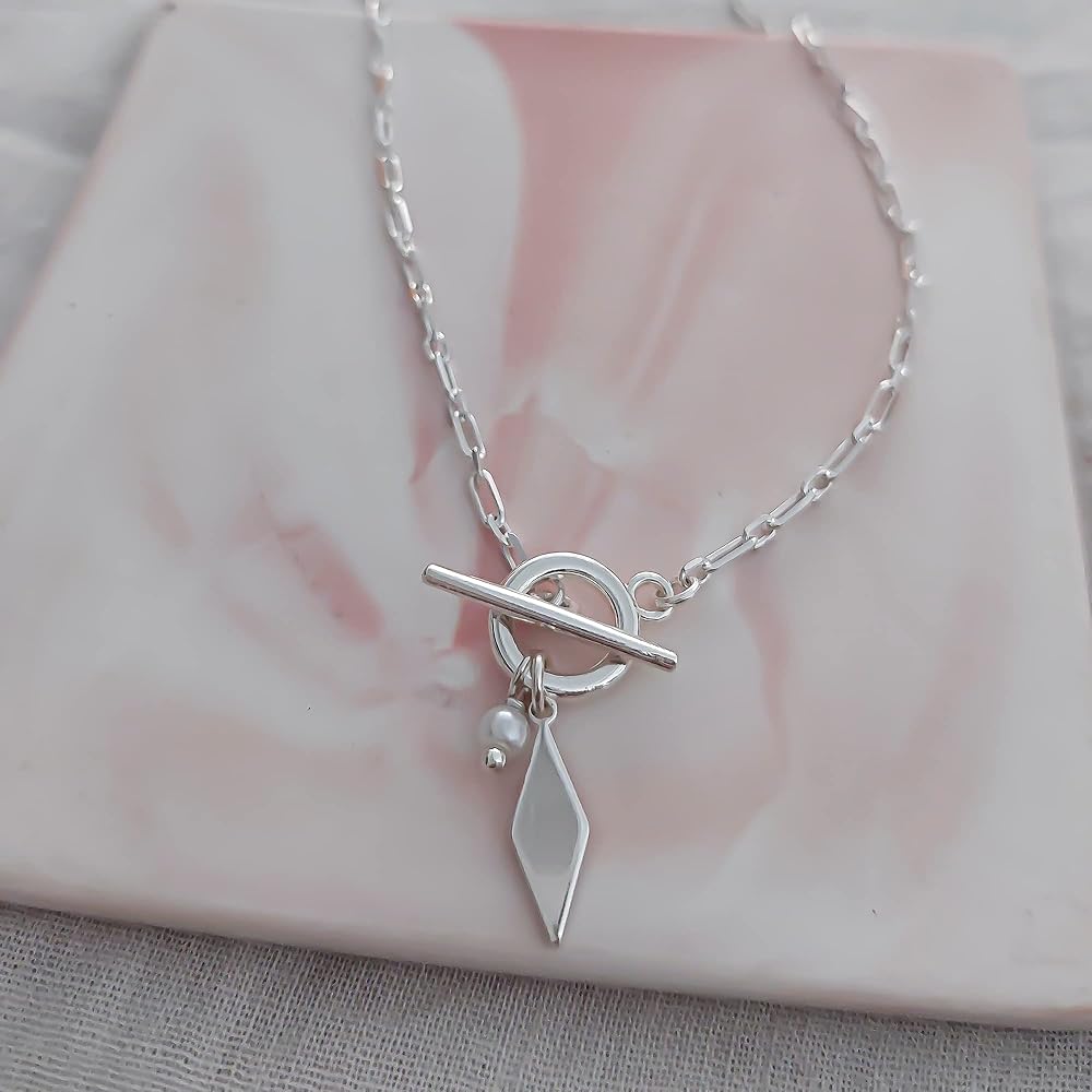 • Dainty T-Bar Necklace For Women with Rhombus and Pearl Bead Charms