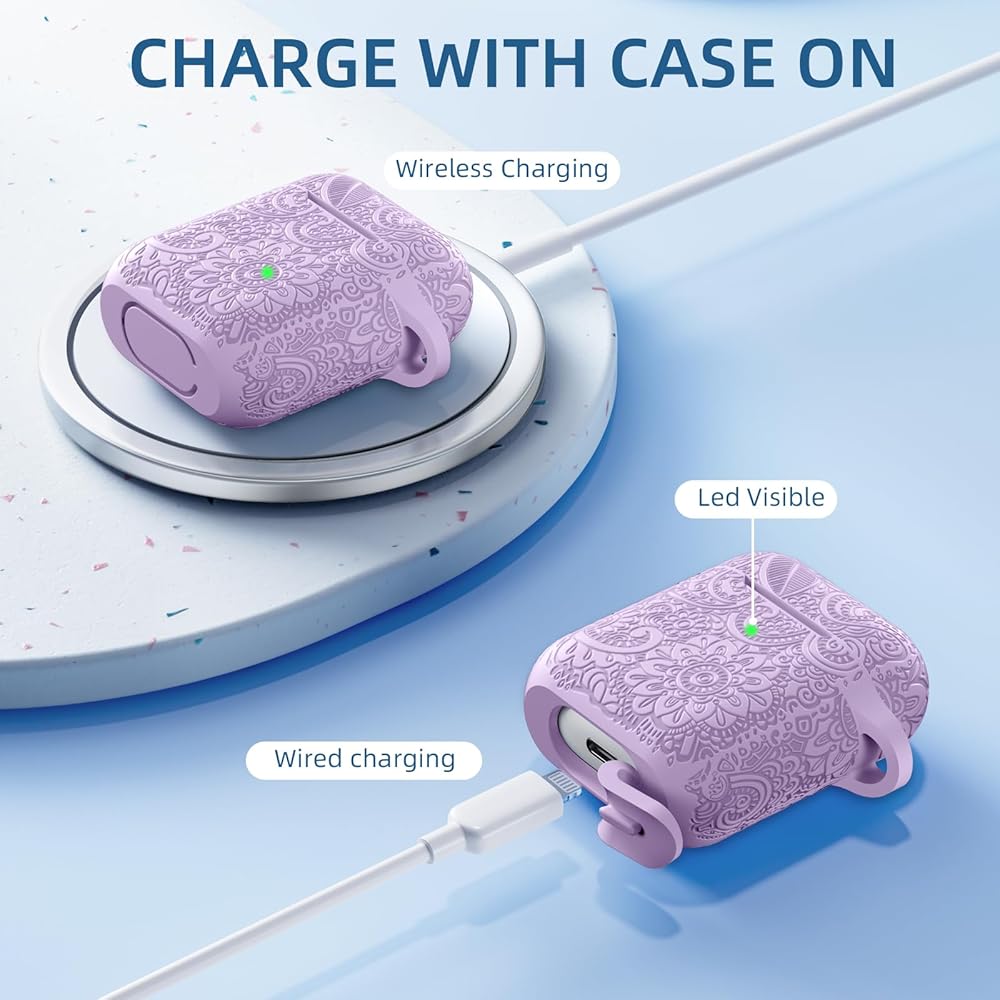 🌺【شحن مريح ومصباح LED أمامي مرئي】فتحات دقيقة محفوظة لمنفذ الشحن وفتحات مكبر الصوت. لا حاجة إلى خلع غطاء الجراب لجهاز Apple Airpods الجيل الثاني/الأول عند الشحن السلكي أو اللاسلكي. مصباح LED الأمامي لعلبة الشحن السلكية واللاسلكية مرئي. لا داعي للقلق بشأن التأثير على نقل الصوت