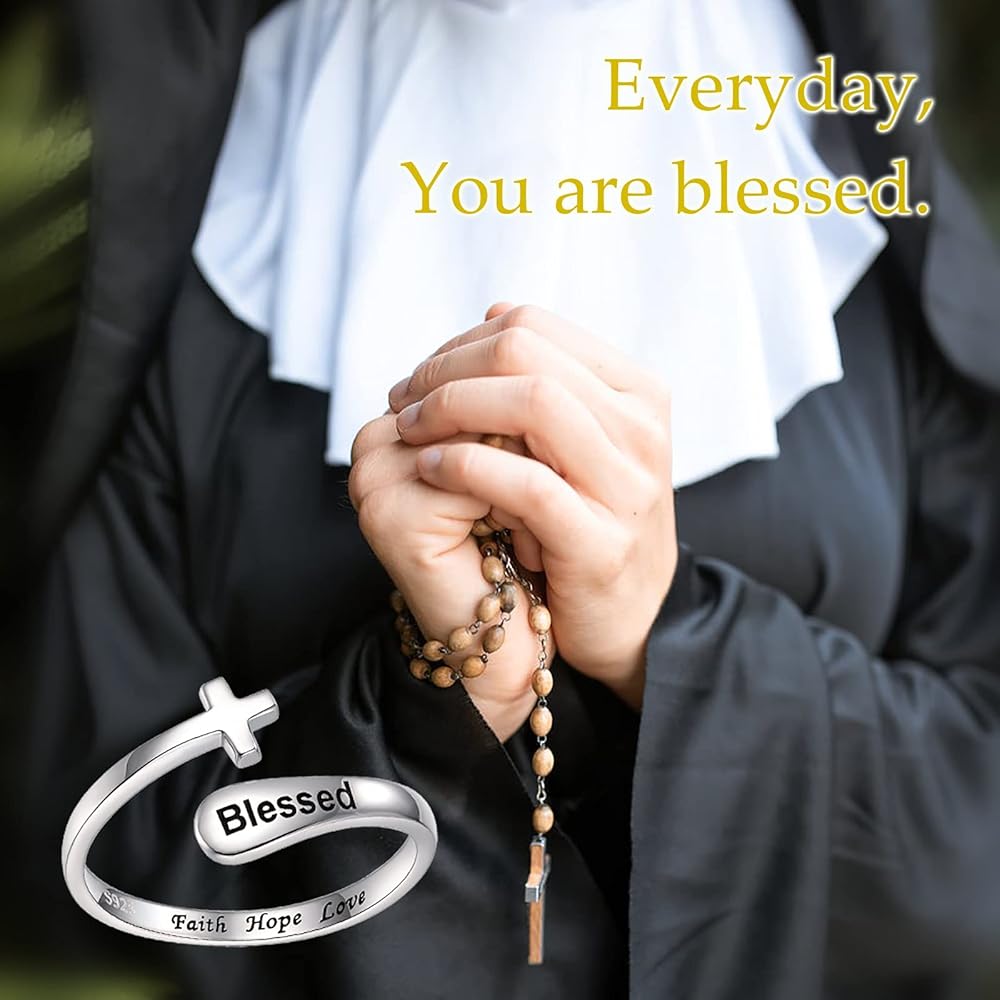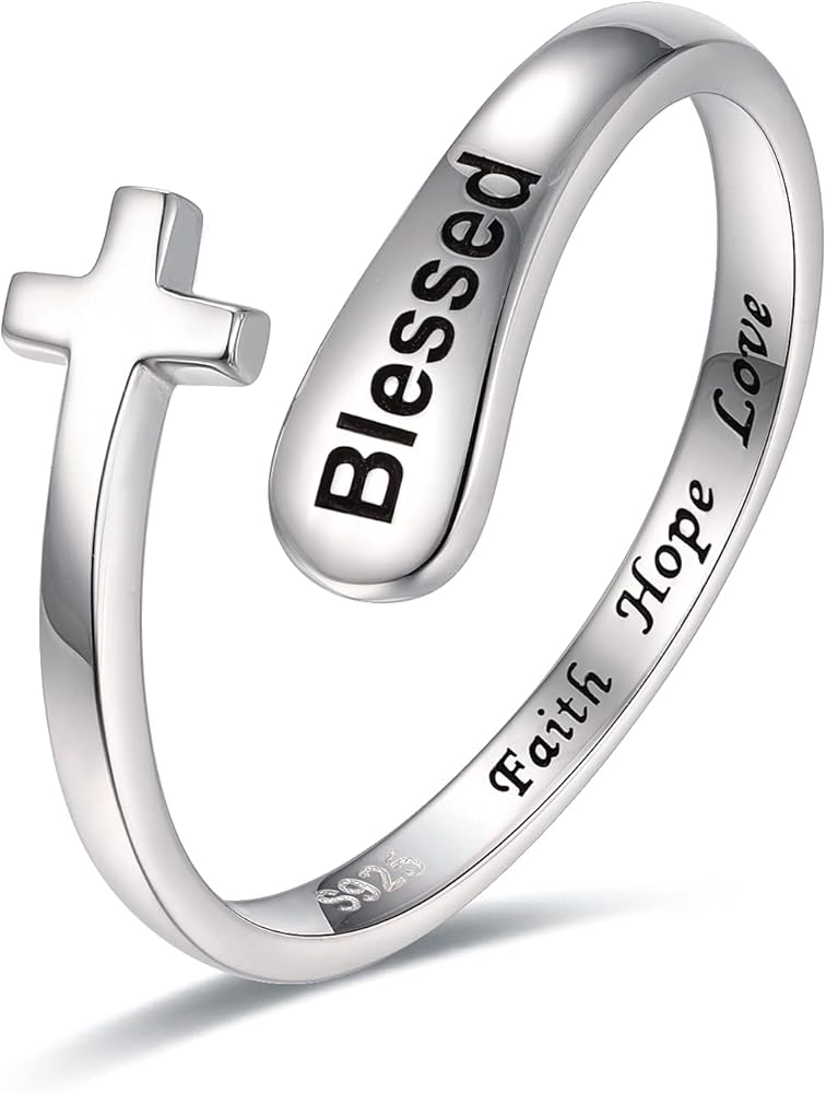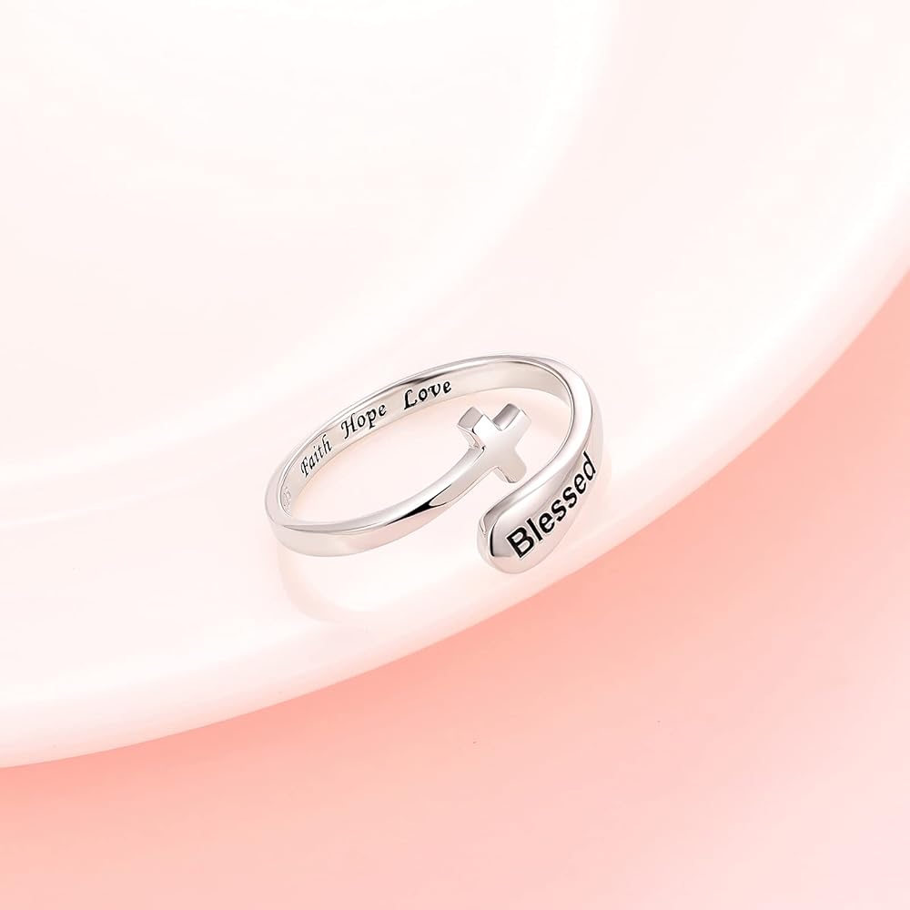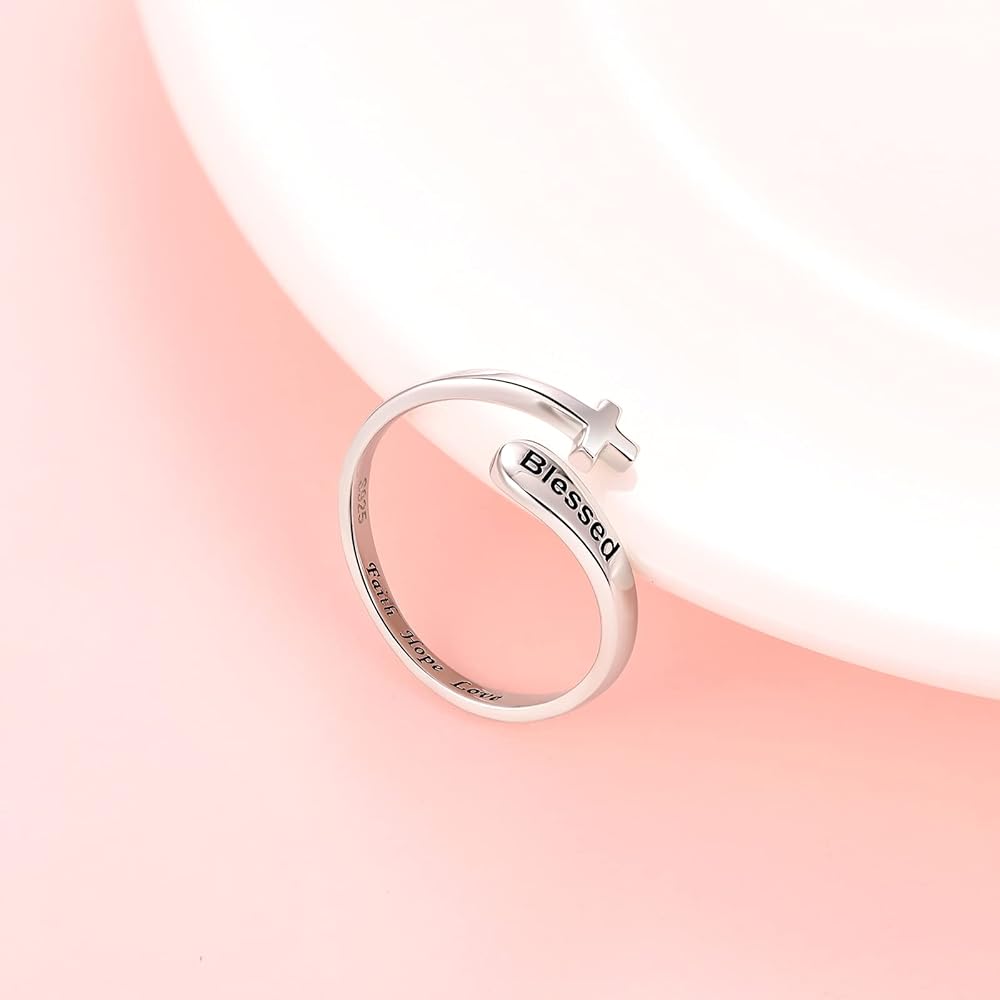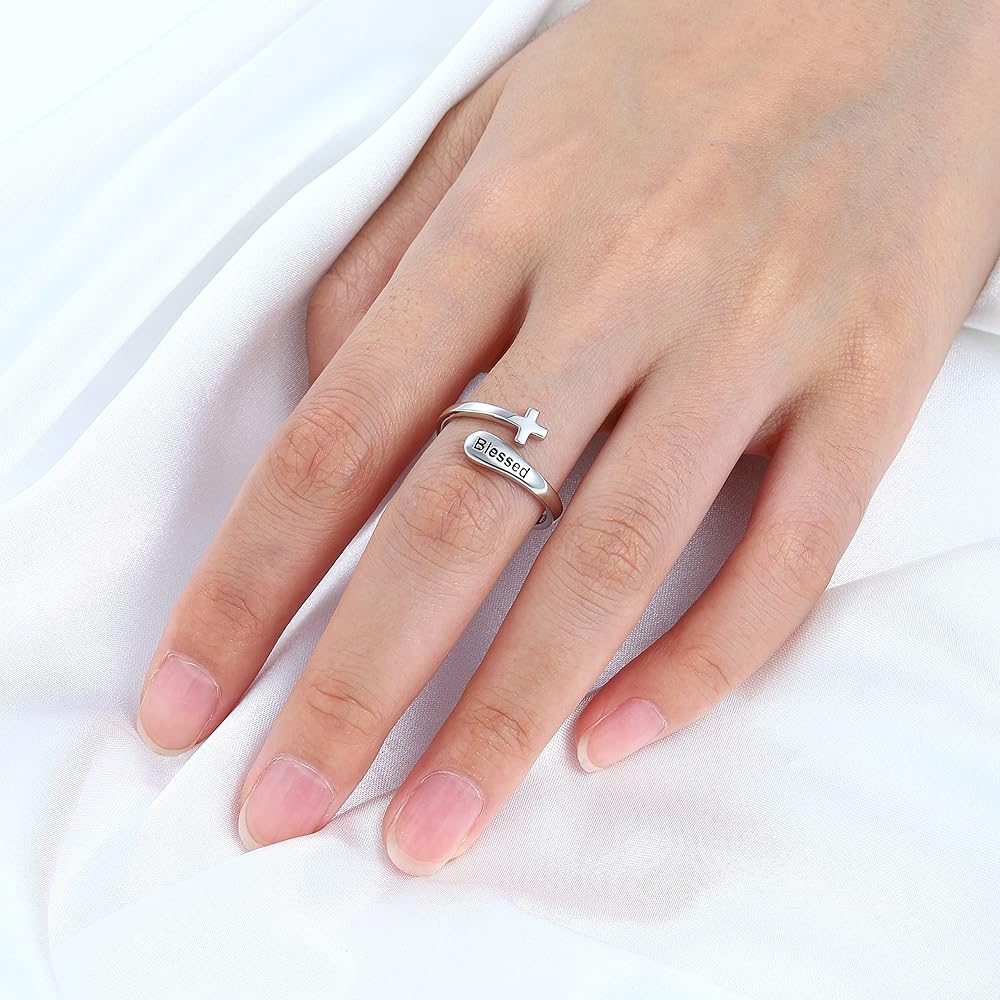 Silver Adjustable Cross Blessed Ring, Cross represents Save and Rescue, Blessed represent Faith and Hope and Love; with god all things are possible, blessing in faith makes all things possible when you doubt the world around you. As the ring is open-designed, so it's flexible and enough to be gently squeezed or slightly flared for adjustment when you want a perfect fit.